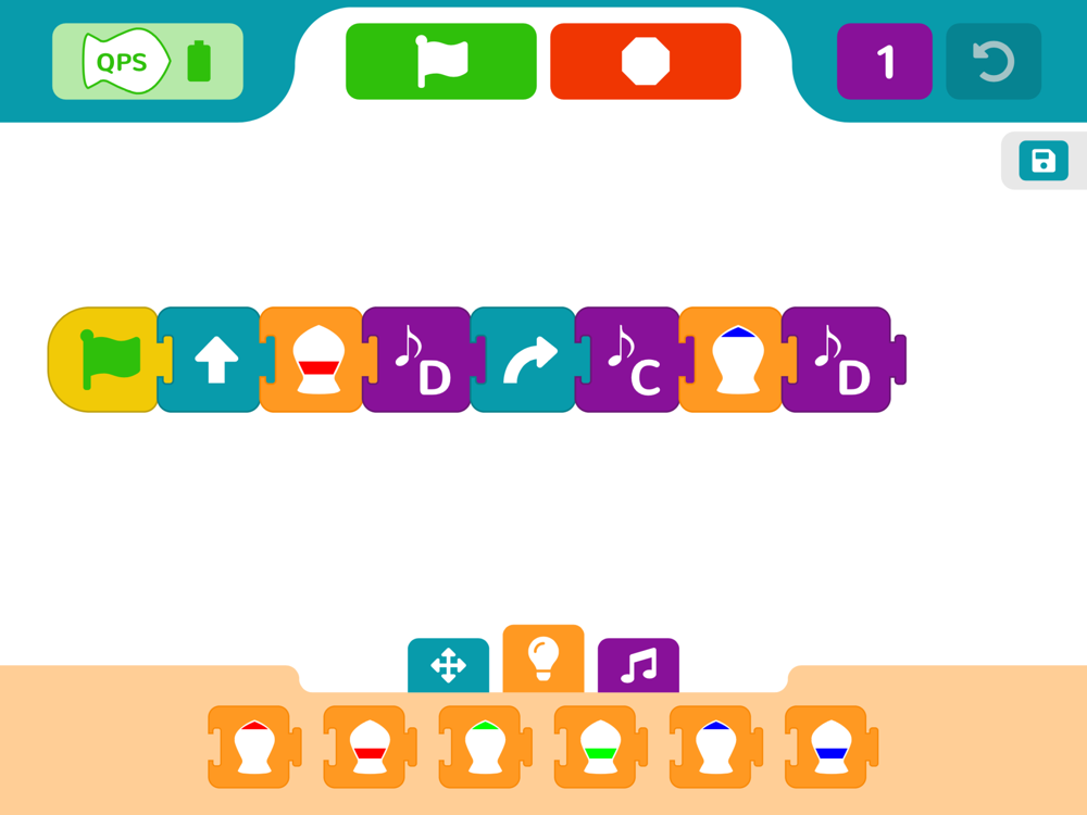 Level 1 introduces sequencing. For example, children connect blocks to make the robot move forward, beep, and then turn left.