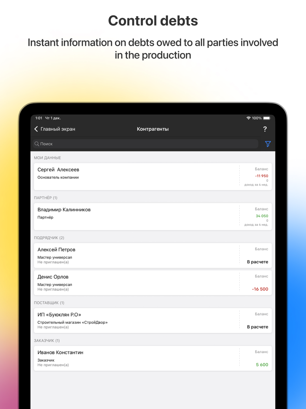 A team work - the application allows to invite customers to collaborative work and thus forget about the paper work forever. Contractors record payments and create the next tasks and you control their work.
