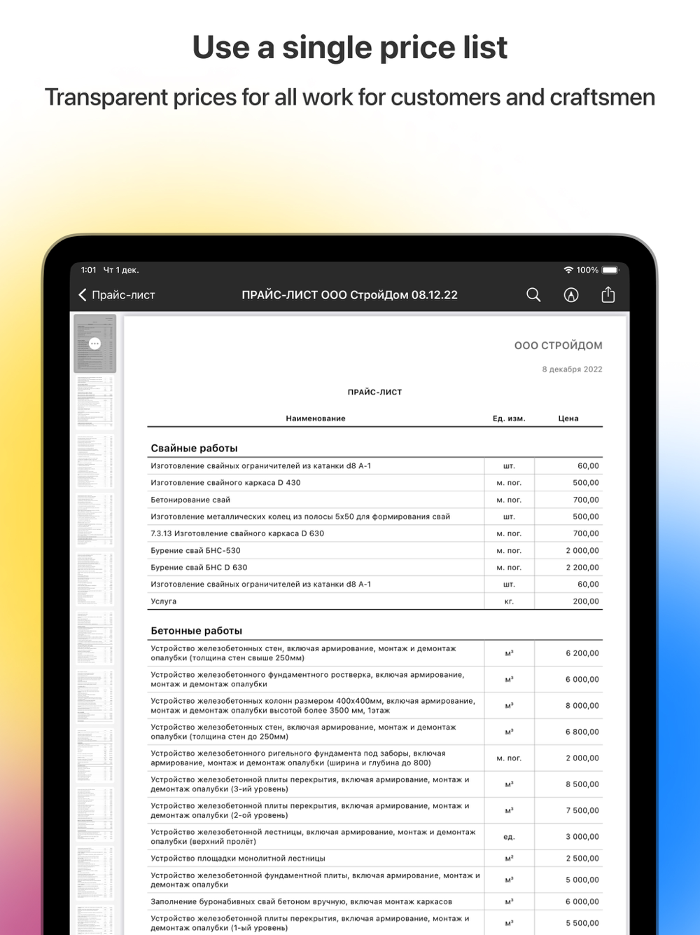 • Price display, according to which the contractor buys material or provides services — now you won't have to win the loyalty of the client as he sees what the money is spent on.