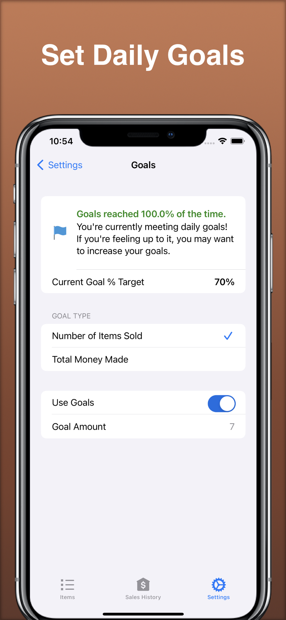Set a daily goal for money made or amount of items sold. Sales Counter will help guide you on if you're hitting your daily goals.