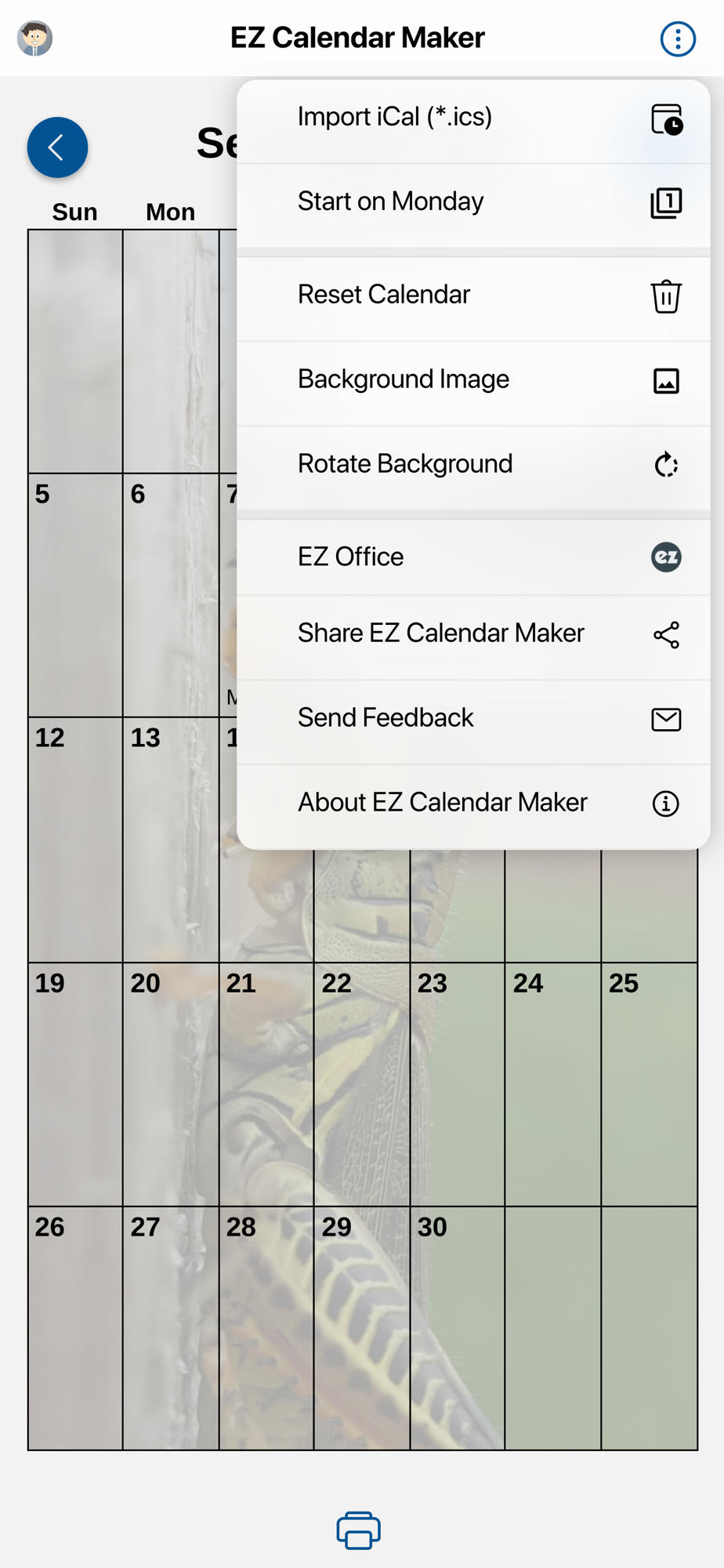 EZ Calendar Maker is a free handy utility for creating and printing clean looking calendars from any device. It is designed to be as easy to use as possible. You can select the month you want to print and do some customization, such as adding a background image to the calendar. Then you simply hit print and a new calendar will come out of your printer! Free and easy to use, EZ Calendar Maker sure beats buying a new calendar from the store every year.