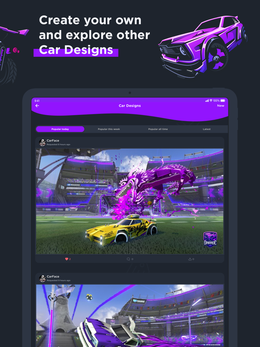 * Car Designer – Create Rocket League car designs right from the app! No need to own the items or even start Rocket League.