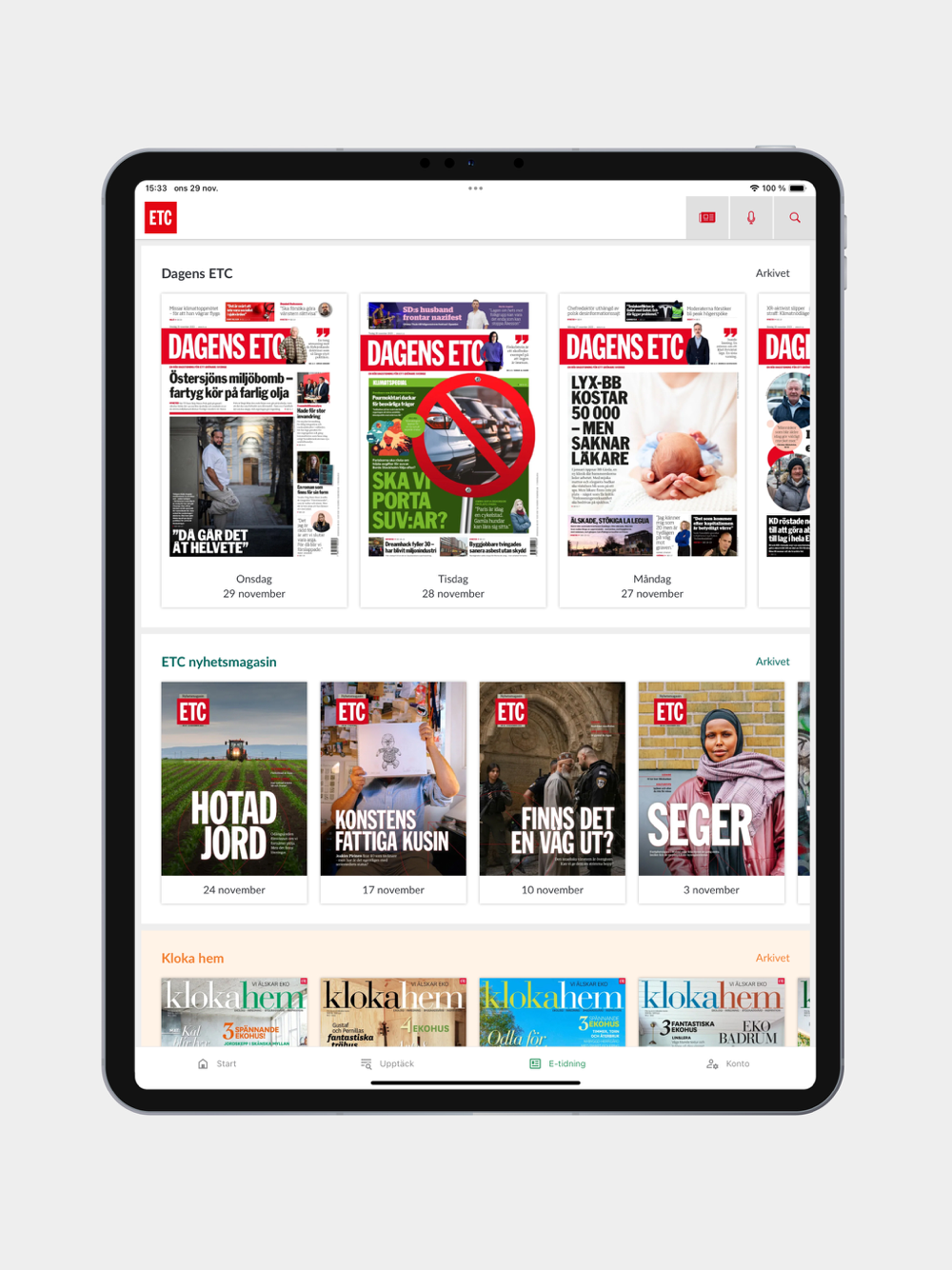 Med appen får du senaste nytt från alla ETC-tidningar och blir uppdaterad om det bästa av vår kvalitetsjournalistik. Bläddra i e-tidningen och välj om du vill läsa artiklar i läsläget eller få dem upplästa.
