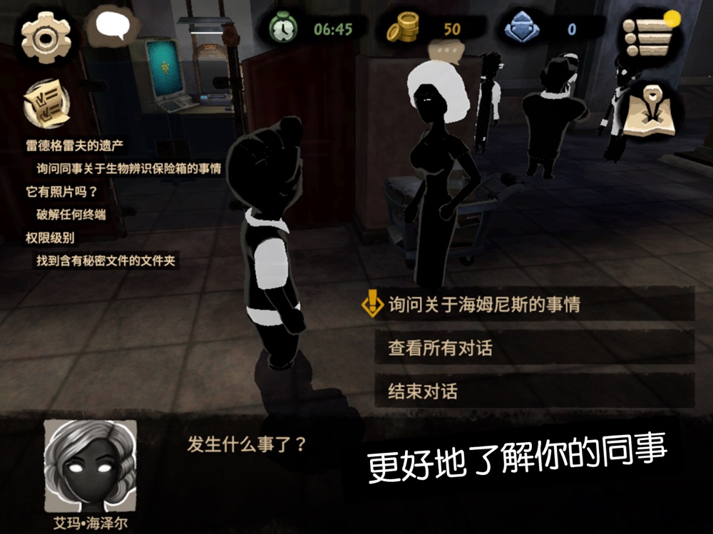 妳需要做的就是通過不斷的完成任務,努力積攢自己的聲望來完成壹次次的晉升,直到站到集團權力的最高點,去選擇自己想要的答案。當然金幣在遊戲中的作用也是格外的重要,小心付不起付房租導致Game Over。