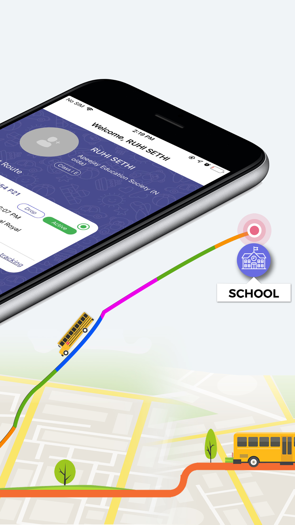 During route active time, live location of the bus along with the upcoming stop details will be provided to the parent.