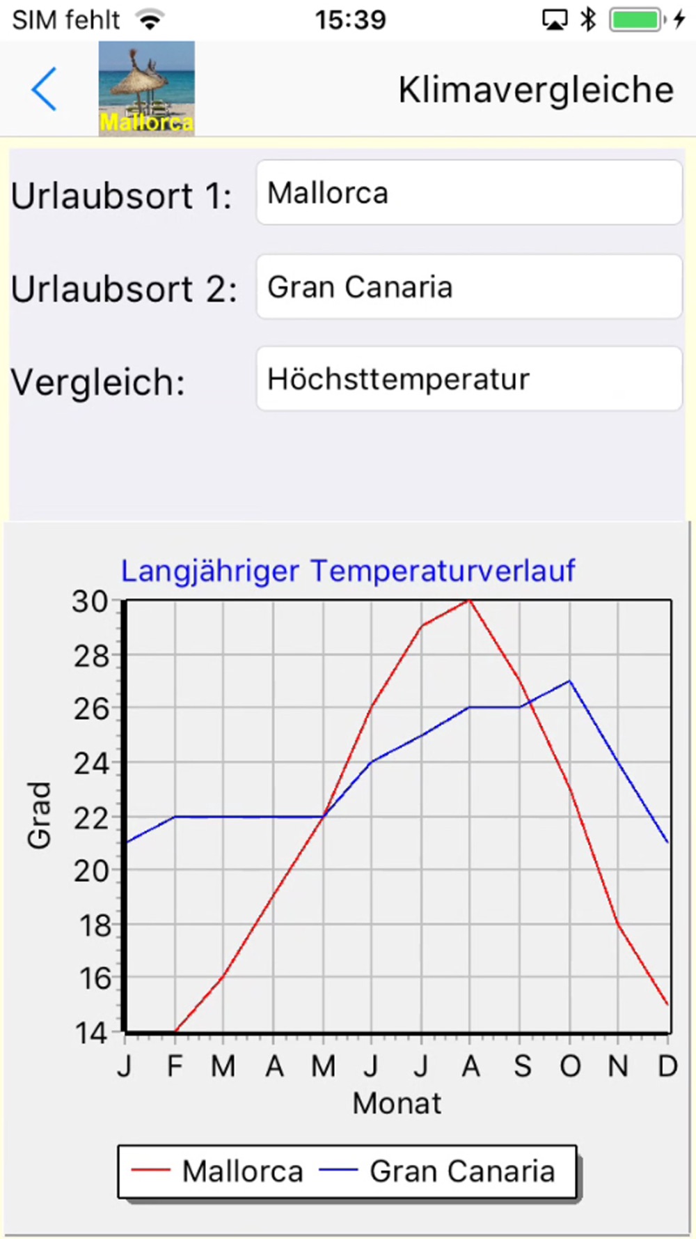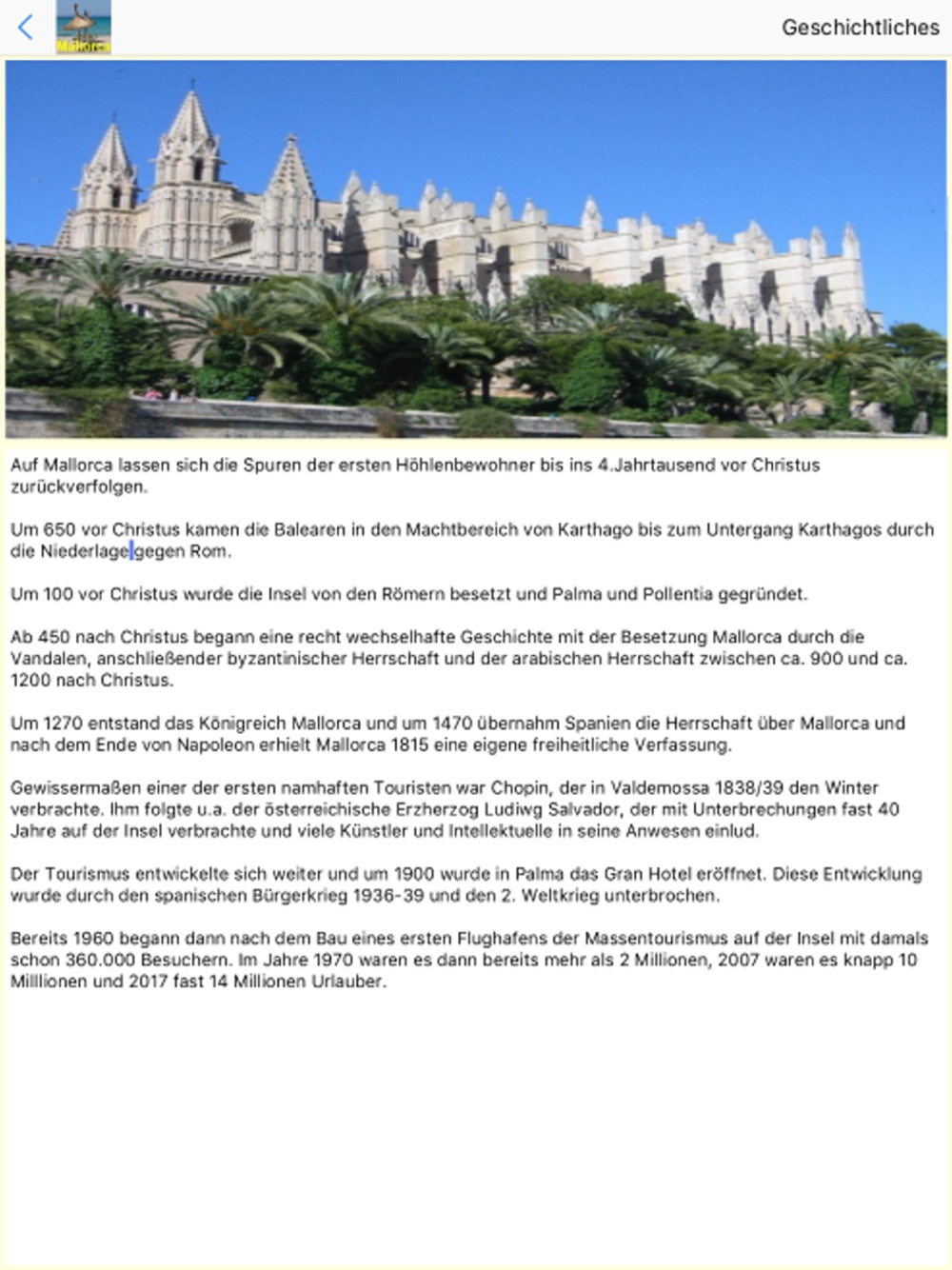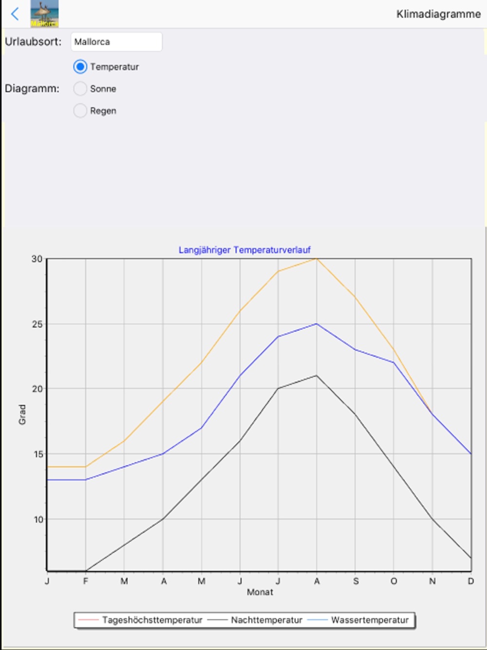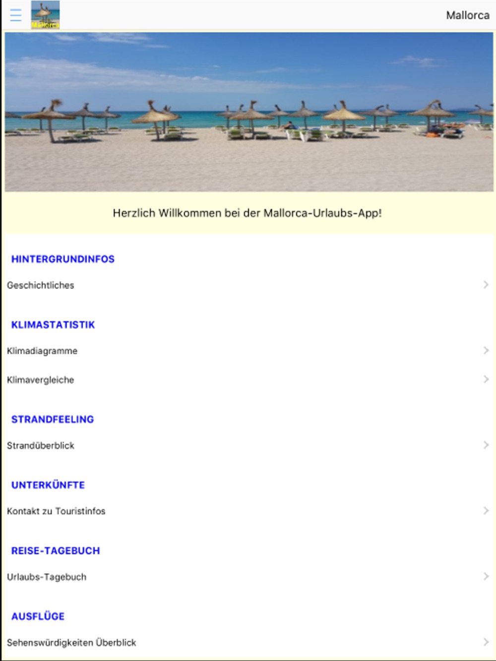 Die Mallorca-App und enthält u.a. Reise-Checklisten für Ihre Reiseapotheke und Ihr Urlaubsgepäck, welche Sie auch selber verfeinern und im nächsten Urlaub wieder benutzen können. Außerdem bietet sie eine Reistagebuch und Wetterstatistiken mit schönen Diagrammen z.B. zum Klimavergleich zweier Urlaubsort. Weiterhin ist eine Sammlung von relevanten Webseiten für die Region vorhanden und gibt Ihnen die Möglichkeit, alle Informationen, die für Ihren Aufenthalt auf Mallorca oder für Sie als Fan von Mallorca interessant sind, möglichst bequem im Internet abzurufen:
