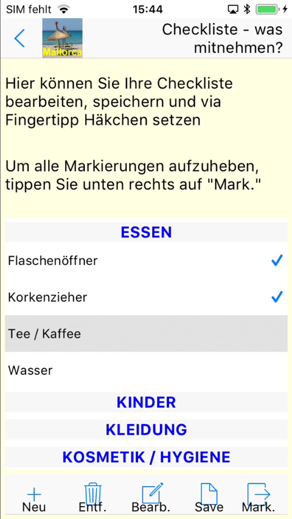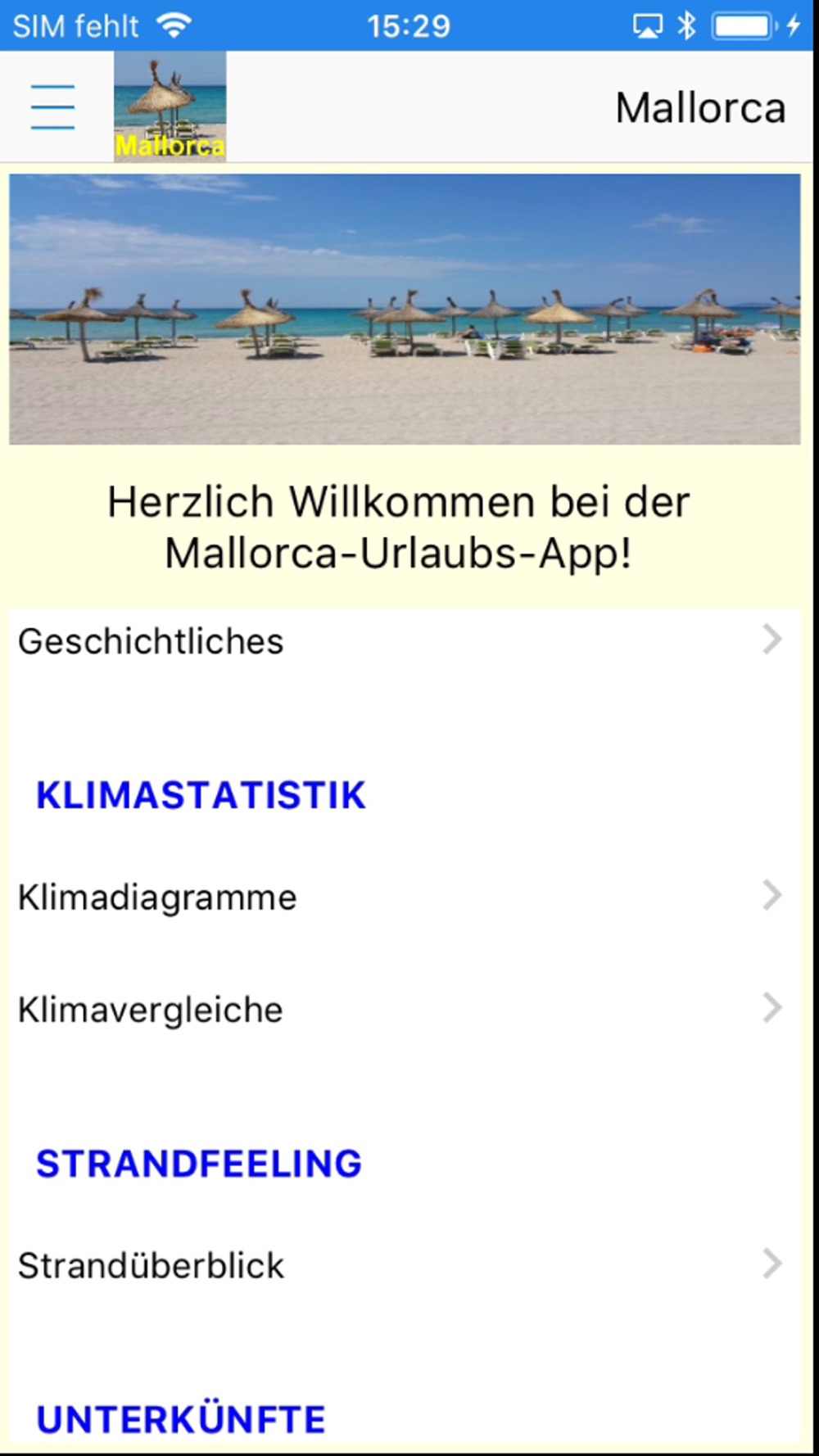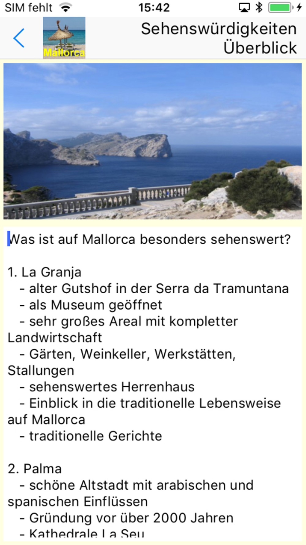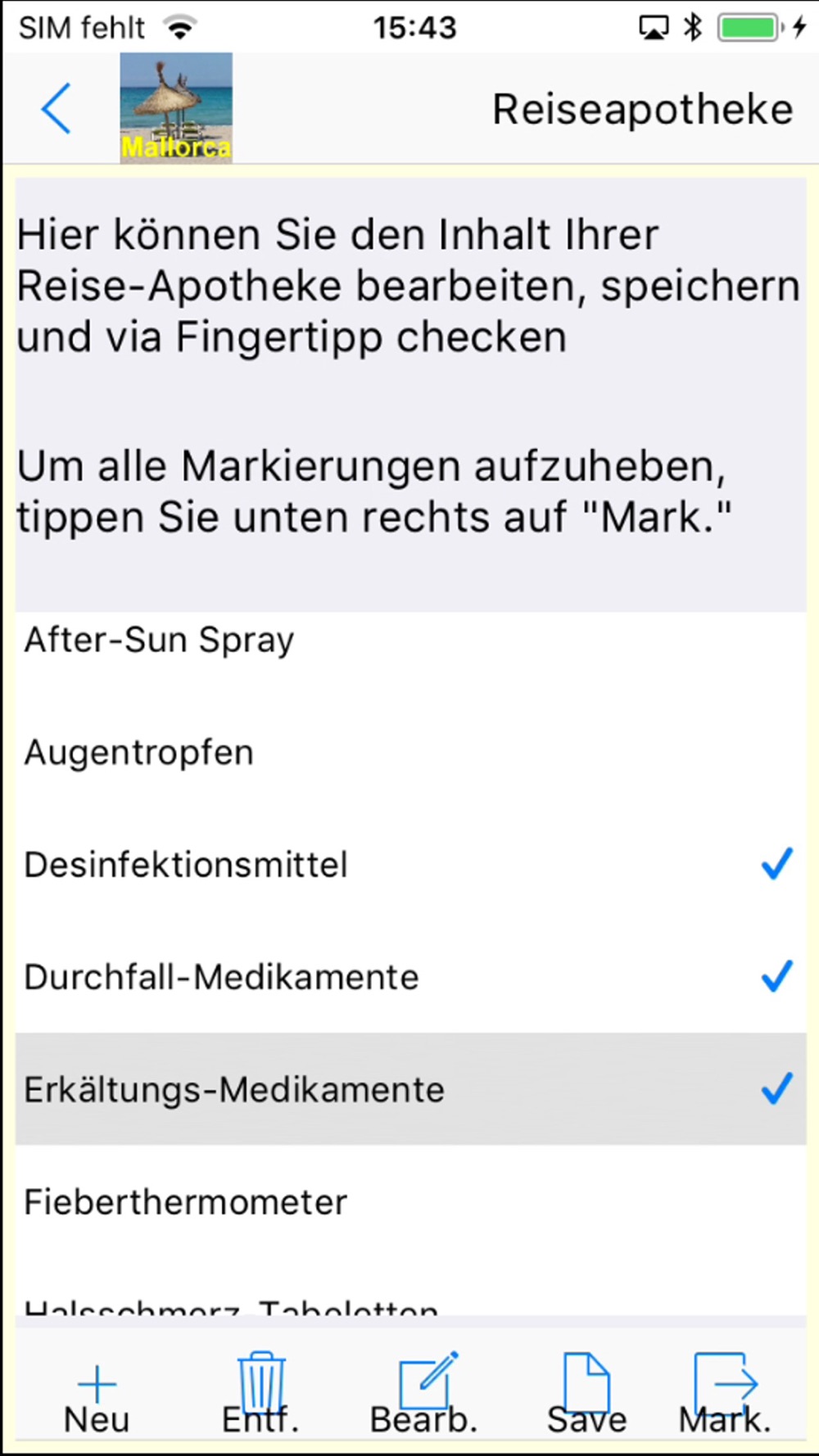 Die Mallorca-App und enthält u.a. Reise-Checklisten für Ihre Reiseapotheke und Ihr Urlaubsgepäck, welche Sie auch selber verfeinern und im nächsten Urlaub wieder benutzen können. Außerdem bietet sie eine Reistagebuch und Wetterstatistiken mit schönen Diagrammen z.B. zum Klimavergleich zweier Urlaubsort. Weiterhin ist eine Sammlung von relevanten Webseiten für die Region vorhanden und gibt Ihnen die Möglichkeit, alle Informationen, die für Ihren Aufenthalt auf Mallorca oder für Sie als Fan von Mallorca interessant sind, möglichst bequem im Internet abzurufen: