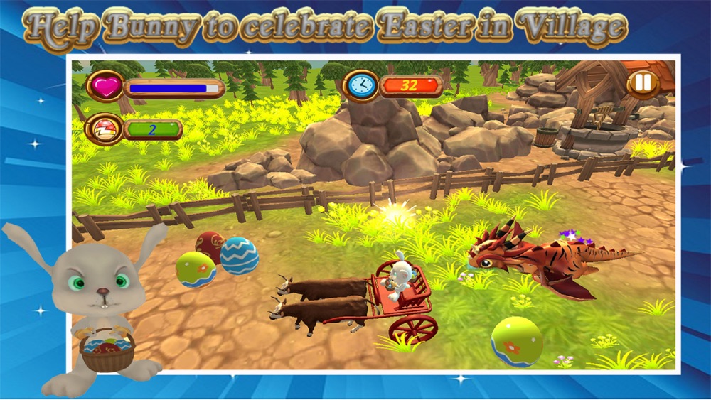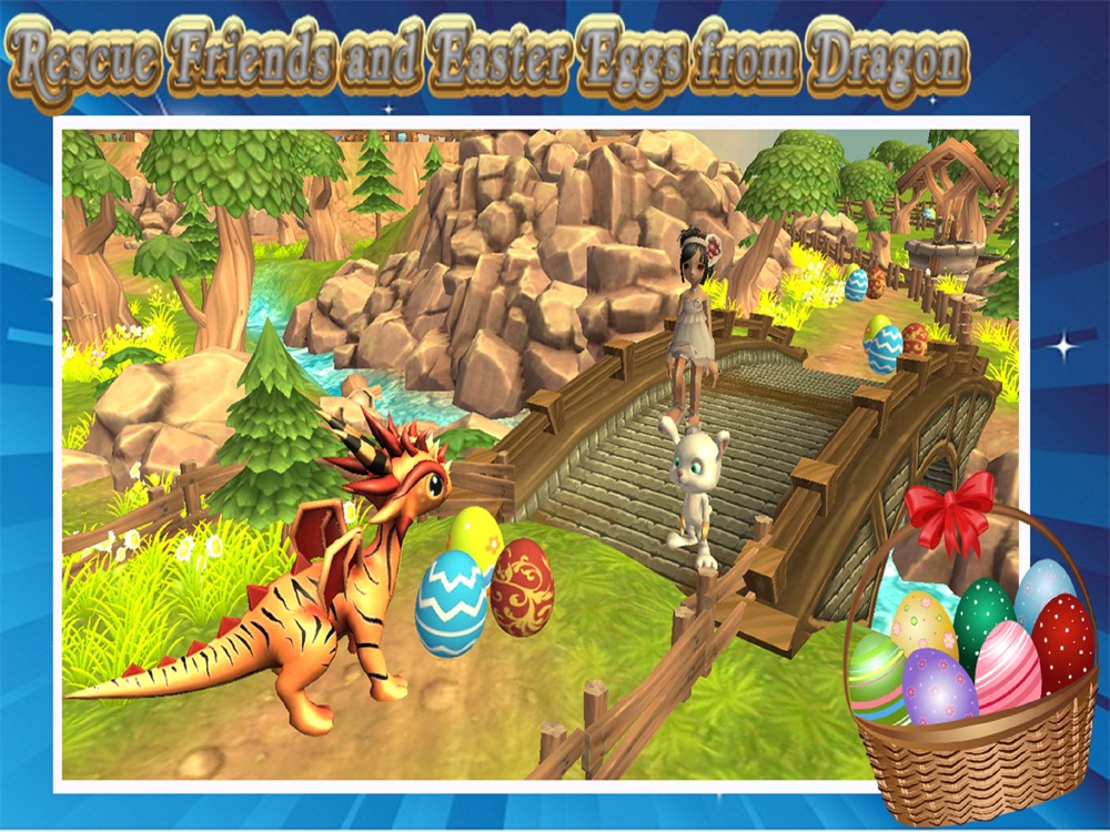 Once upon a time there was a little bunny. On every Easter, bunny deliver egg to kids in village and city. One crazy dragon came in village and city for searching her lost eggs. Dragon did not found her eggs and start to destroy Easter egg with fire. Bunny came and try to rescue egg from crazy dragon, for little kids for coming Easter event. Bunny rescue egg in both village and city for celebrating the Easter event with more cheers.