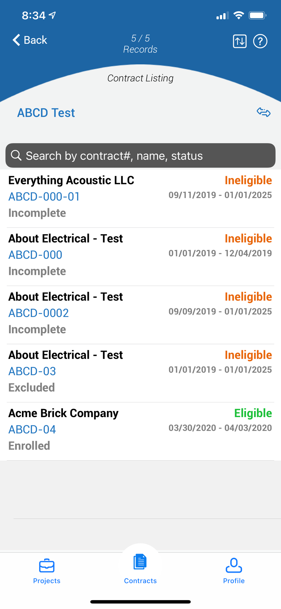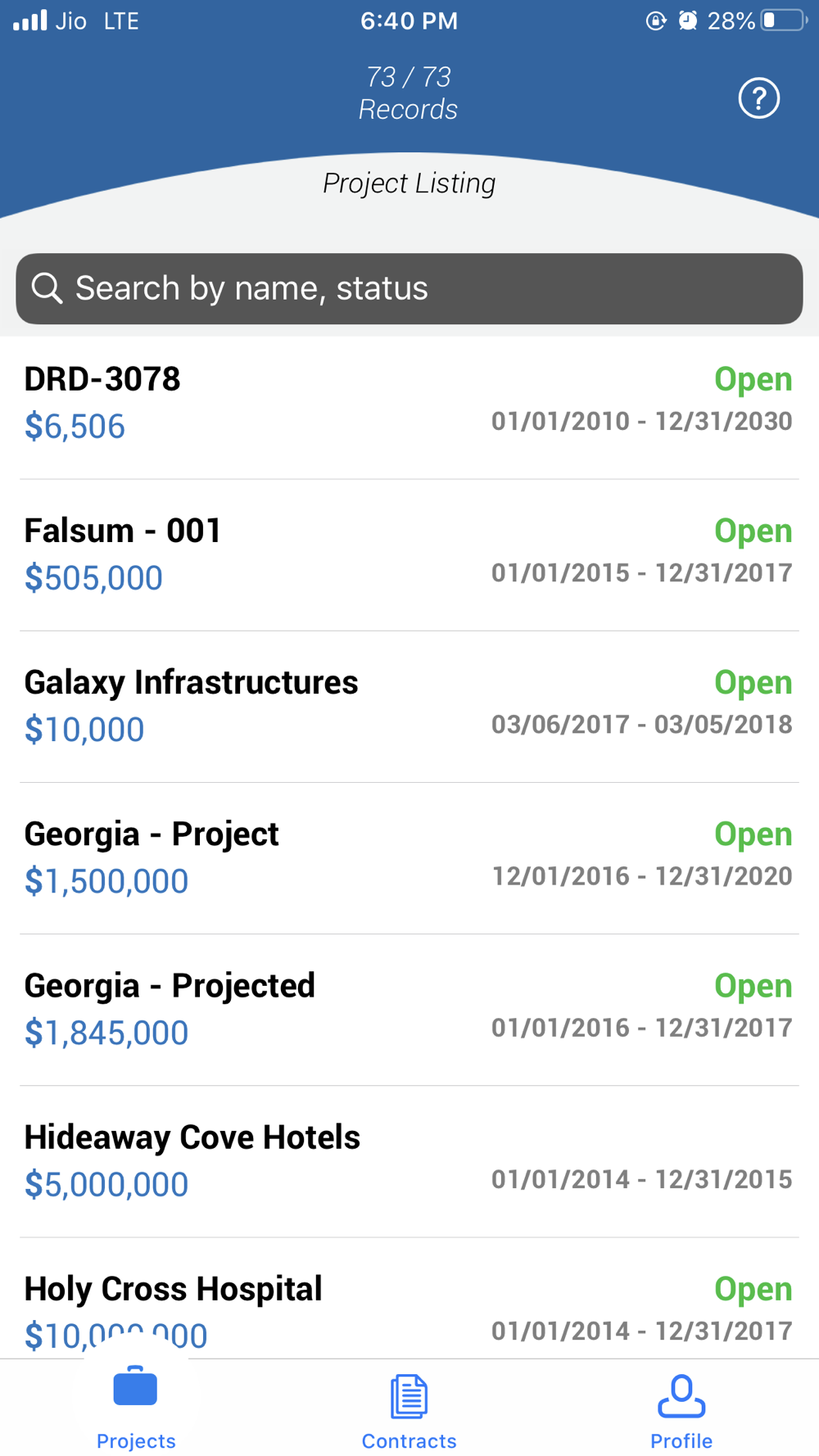 Upon logging into the application, you can instantly view the following information like Listing of Projects Contracts, Contract details and Payrolls.