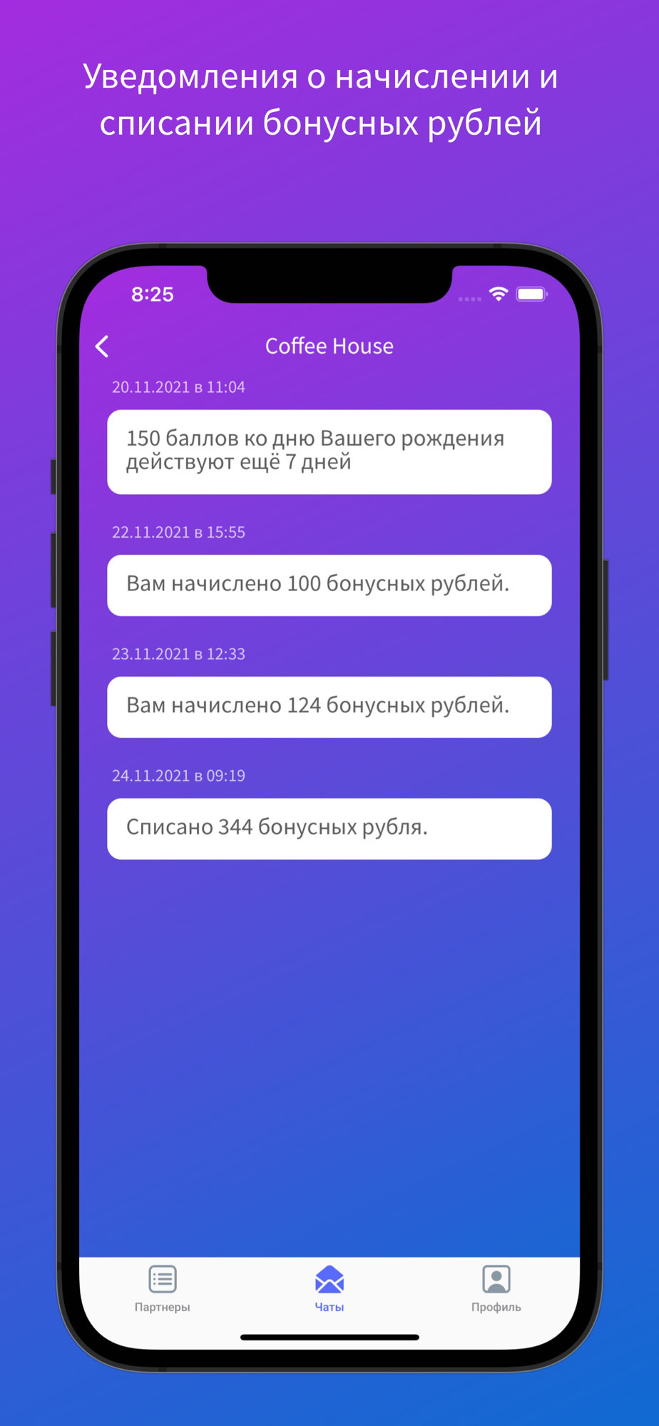 * Список уведомлений от партнера (начисление/списание бонусов);