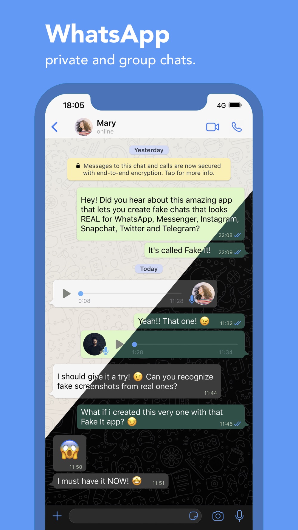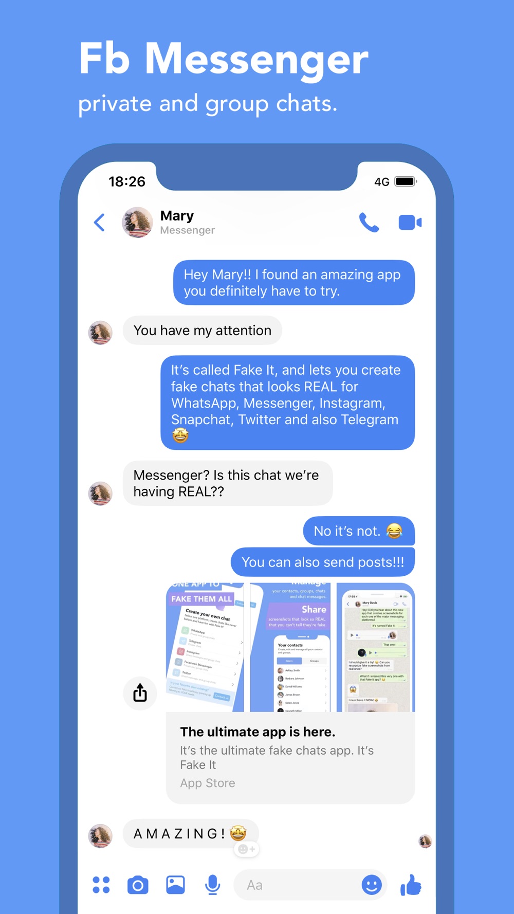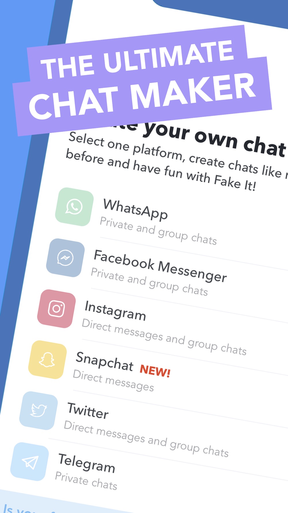 What if you could create aa amazing and realistic chat, with different contents like texts, images, audio messages, posts, likes, tweets, and skin it like it was a real WhatsApp chat, or a Telegram one, Instagram direct messages, Facebook Messenger, Snapchat, or Twitter, and you could do all of this stuff within the same app?