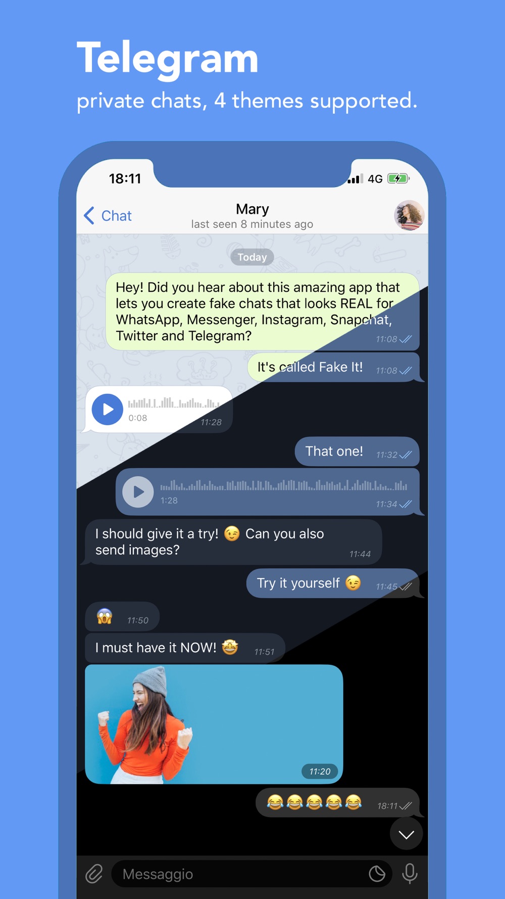 Make It is the most realistic and detailed chat maker app in the AppStore. With Make It, you can replicate the tiniest details that each one of these platforms have: details like the scroll indicator arrow of WhatsApp, all four Telegram themes, the presence or absence of Instagram stories for the contact you selected and much more.