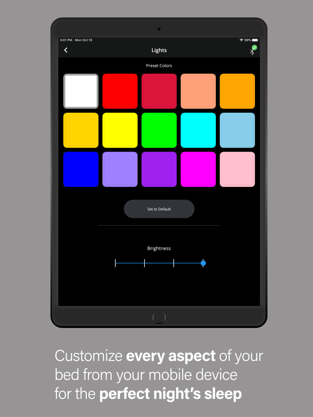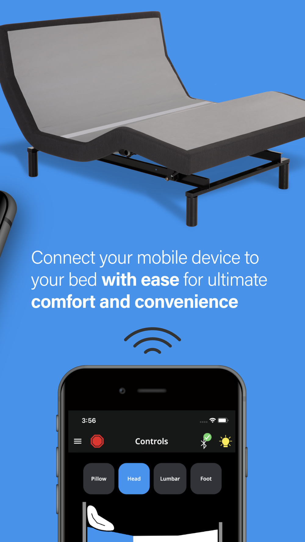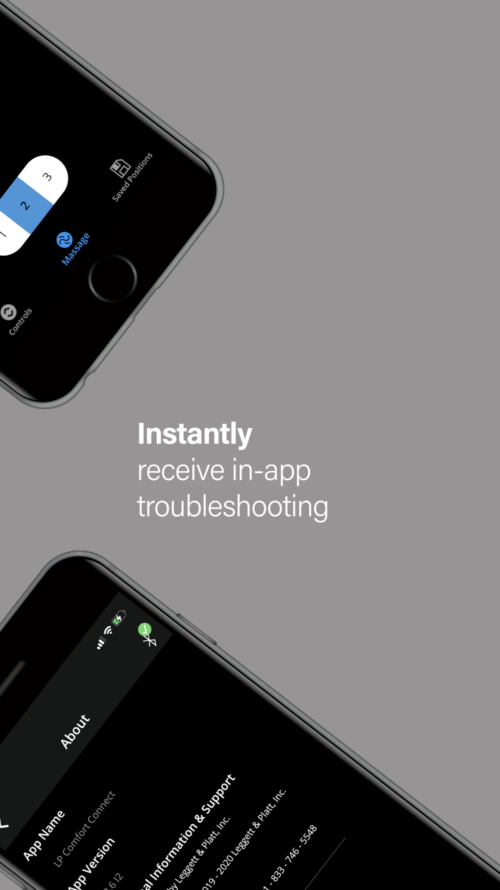 Mobile application to enable the best comfort and relaxation right in your home through the LP Comfort Connect enabled adjustable beds. To utilize this mobile app, an LP Comfort Connect enabled adjustable bed is required. This application provides features such as adjusting the bed position, head and foot massage, saved positions, and multi-colored under-bed-lighting.