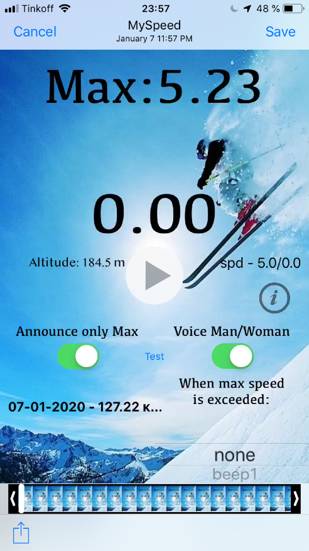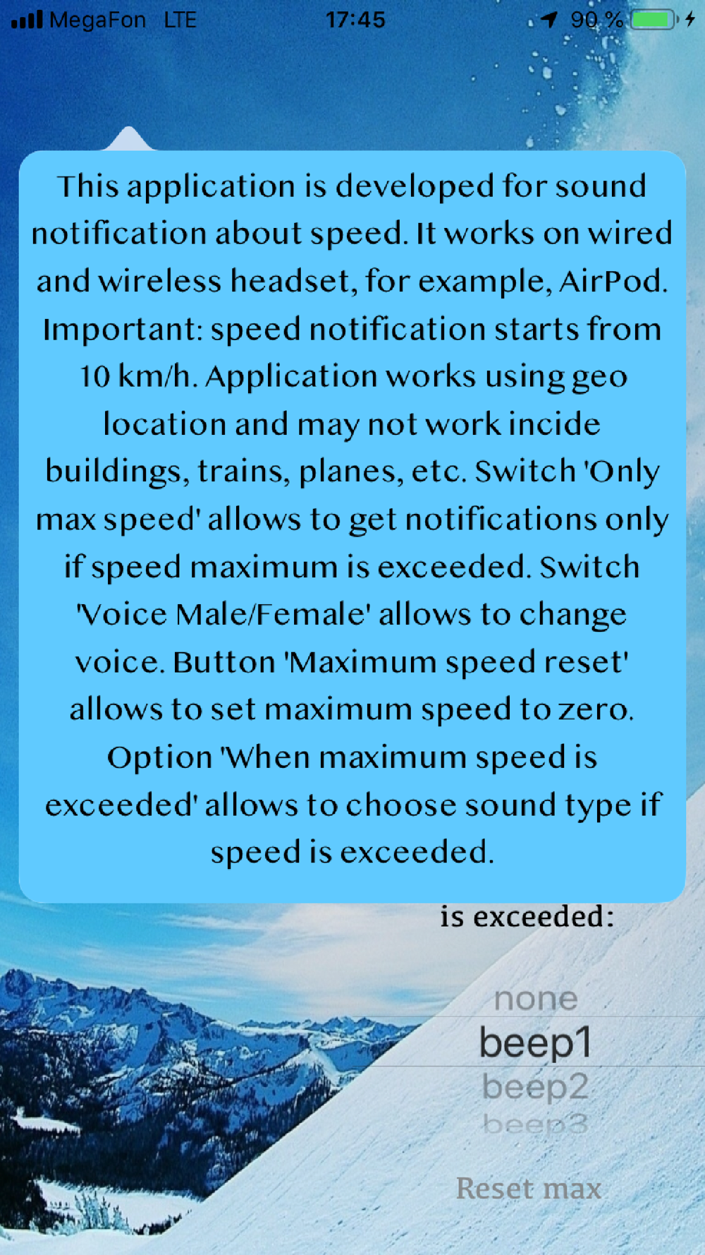 This application announce speed by voice via headset wireless and not wireless. It can announce your max speed and current speed. You can use some different voices.