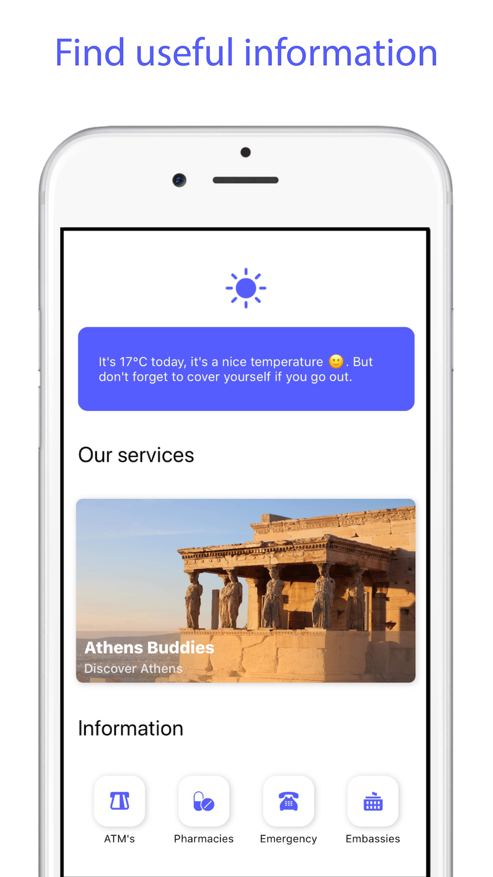 Our app simplifies your stay in Athens by providing you with practical informations and unique activities in order to discover and explore Athens.