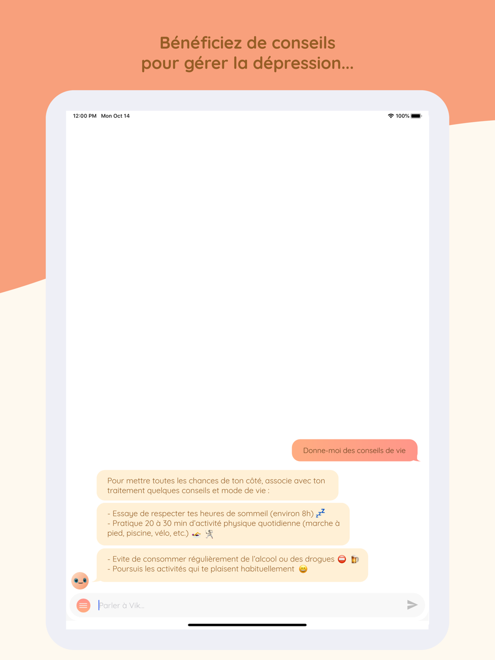 Vik Dépression est un compagnon virtuel qui répond à vos questions et celles de vos proches concernant la dépression.