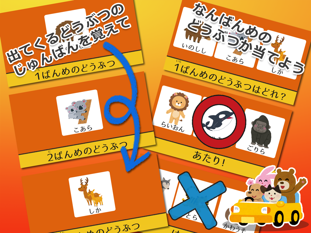 順番に登場する3頭の動物が「何番目に出てきたか」を覚えて答えるシンプルな“記憶力ゲーム”です。