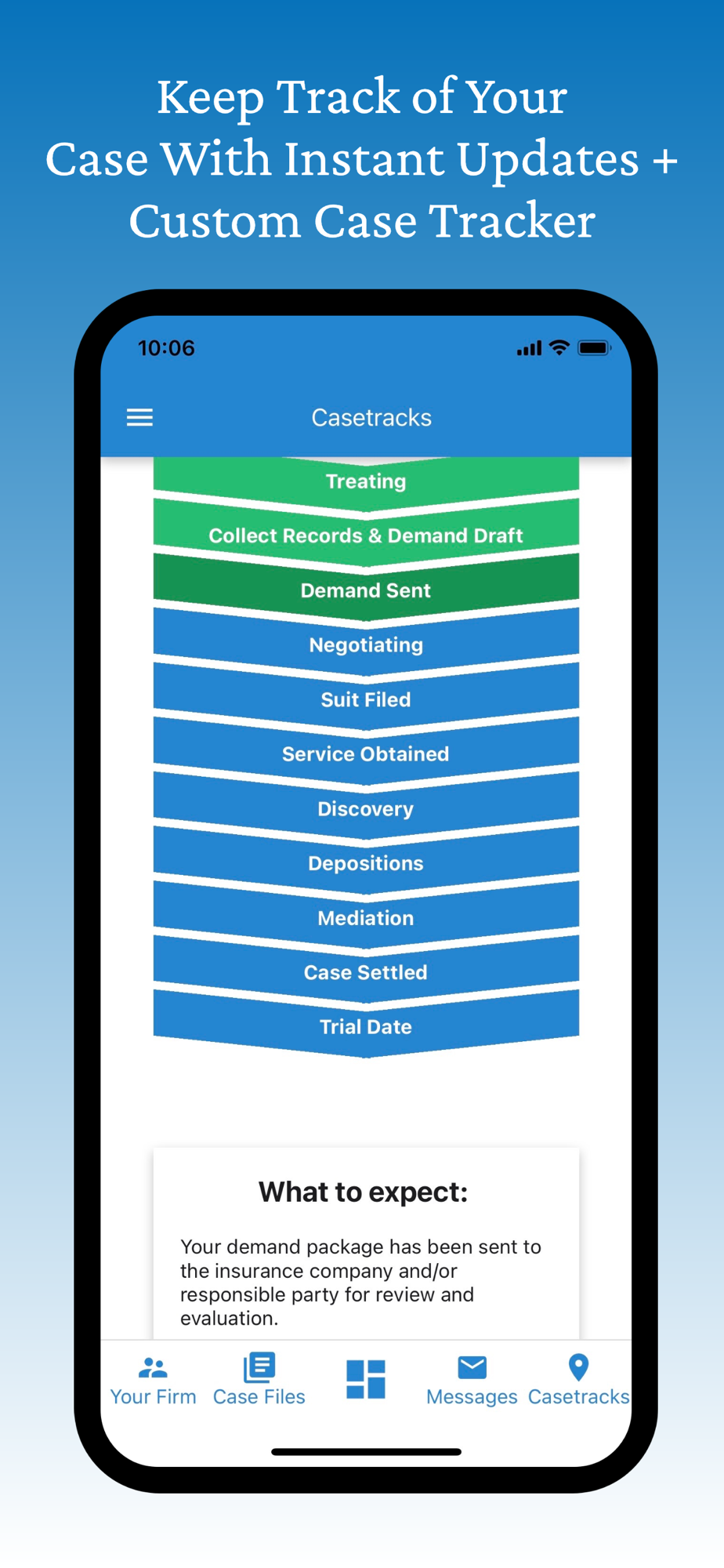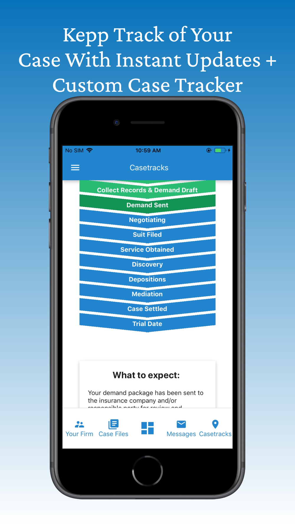 o Every legal case has tracks that, if followed, lead to its eventual conclusion. Casetracks uses a one of a kind case tracker to instantly allow legal teams to notify and update clients about what is going on in their legal case.