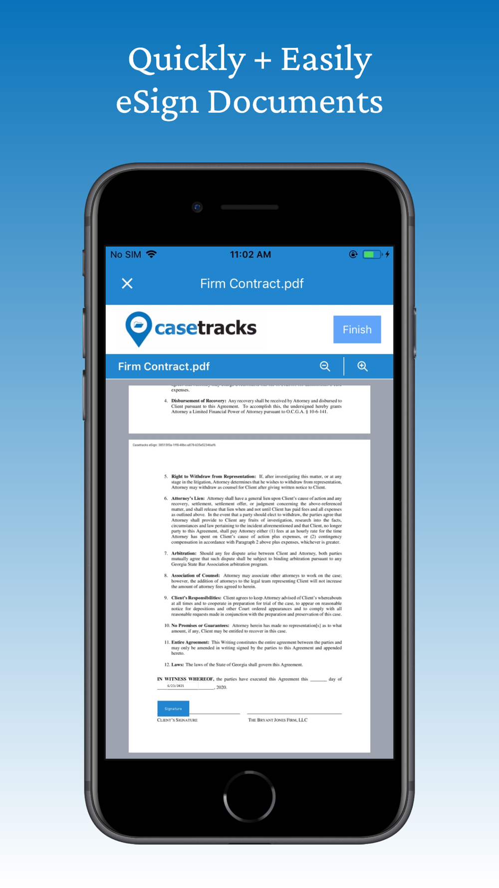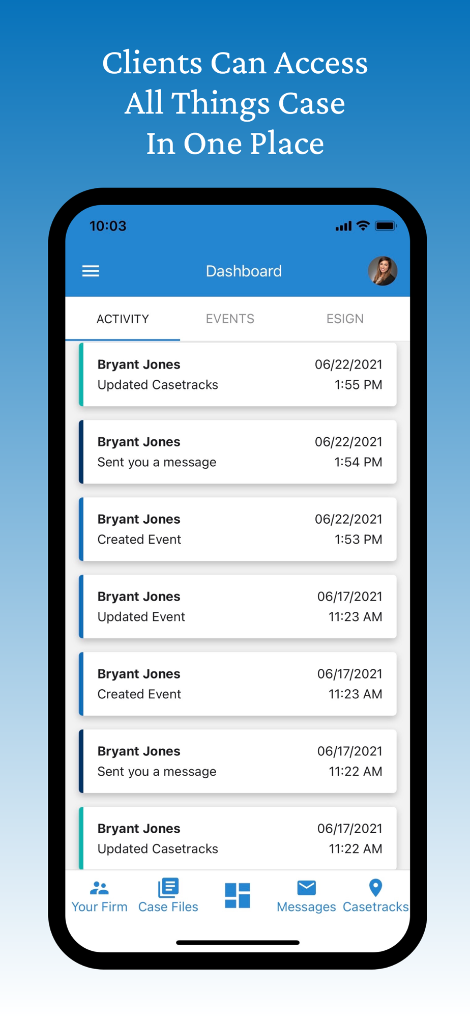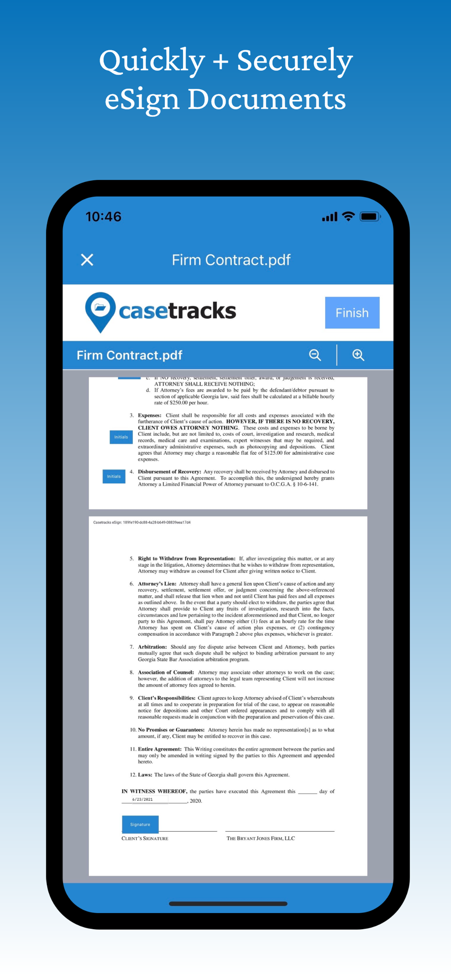 o To make life even easier, Casetracks organizes and streamlines each client’s case to allow both clients and law firm users to quickly, easily, and securely access important case information, case documents/photos, client messages, case events, and eSignatures, all from any device with an internet connection.