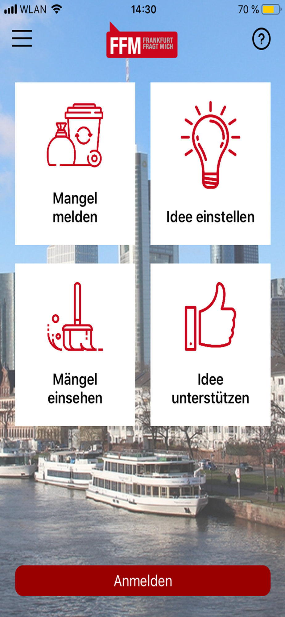 Sind Sie bereits auf www.ffm.de registriert, können Sie sich mit diesen Zugangsdaten auch in der App anmelden, Ideen einstellen und Mängel melden. Sollten Sie Ideen nur lesen oder einen Mangel melden wollen, müssen Sie sich nicht registrieren. Die Registrierung können Sie in der App oder auf dem Portal vornehmen.