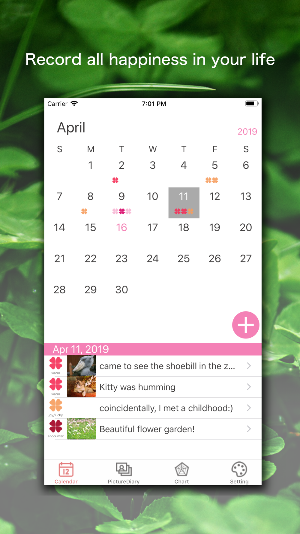 - A clover-shaped stamp displayed on the calendar expresses input information.