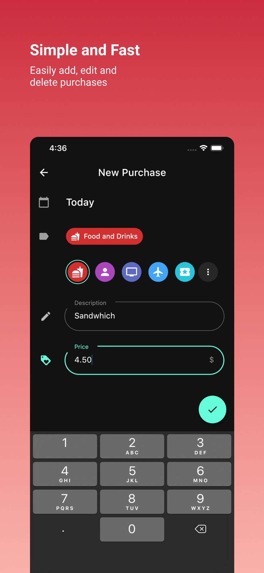 Purchase Tracker is a minimalistic app to track your personal expenses. It helps you keep track of what you buy with a beautiful and simple interface. Just a few clicks and your purchases are added!