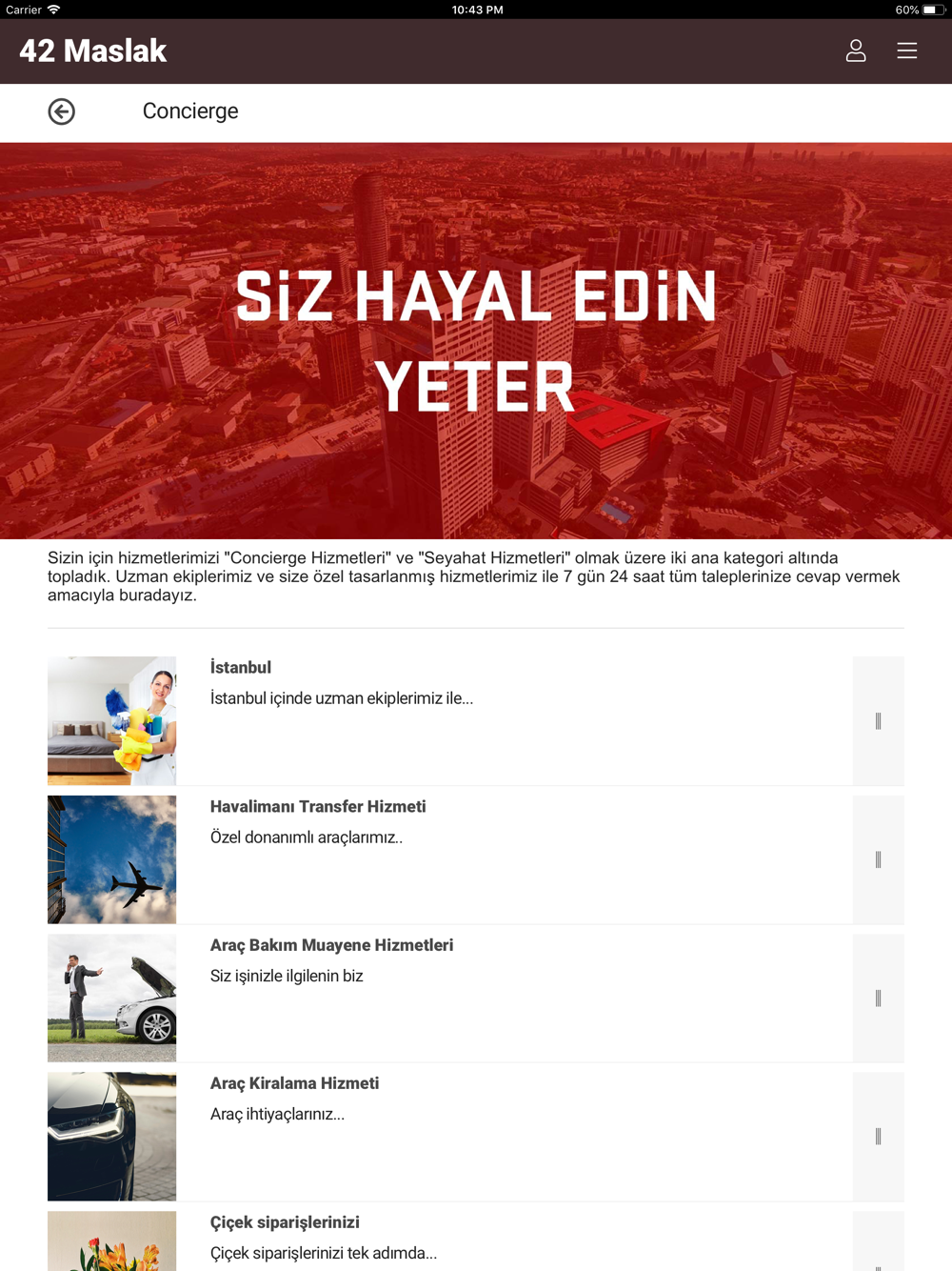 42 Maslak için geliştirilen akıllı yaşam uygulaması 42 Maslak Concierge`i telefonuna indir ve hemen kullanmaya başla. En son etkinlikler, önemli duyurular, size özel anketler, ziyaretçi tanımlama, concierge hizmetleri ve daha birçok özellik 42 Maslak Concierge uygulamasında sizi bekliyor.