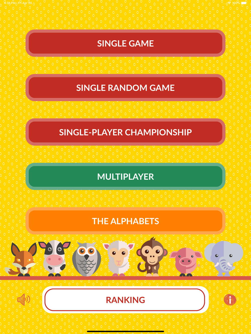 - Single-player championship: organized in levels, it starts with a minimum number of cards of the Englilsh alphabet and once completed it moves to other languages;