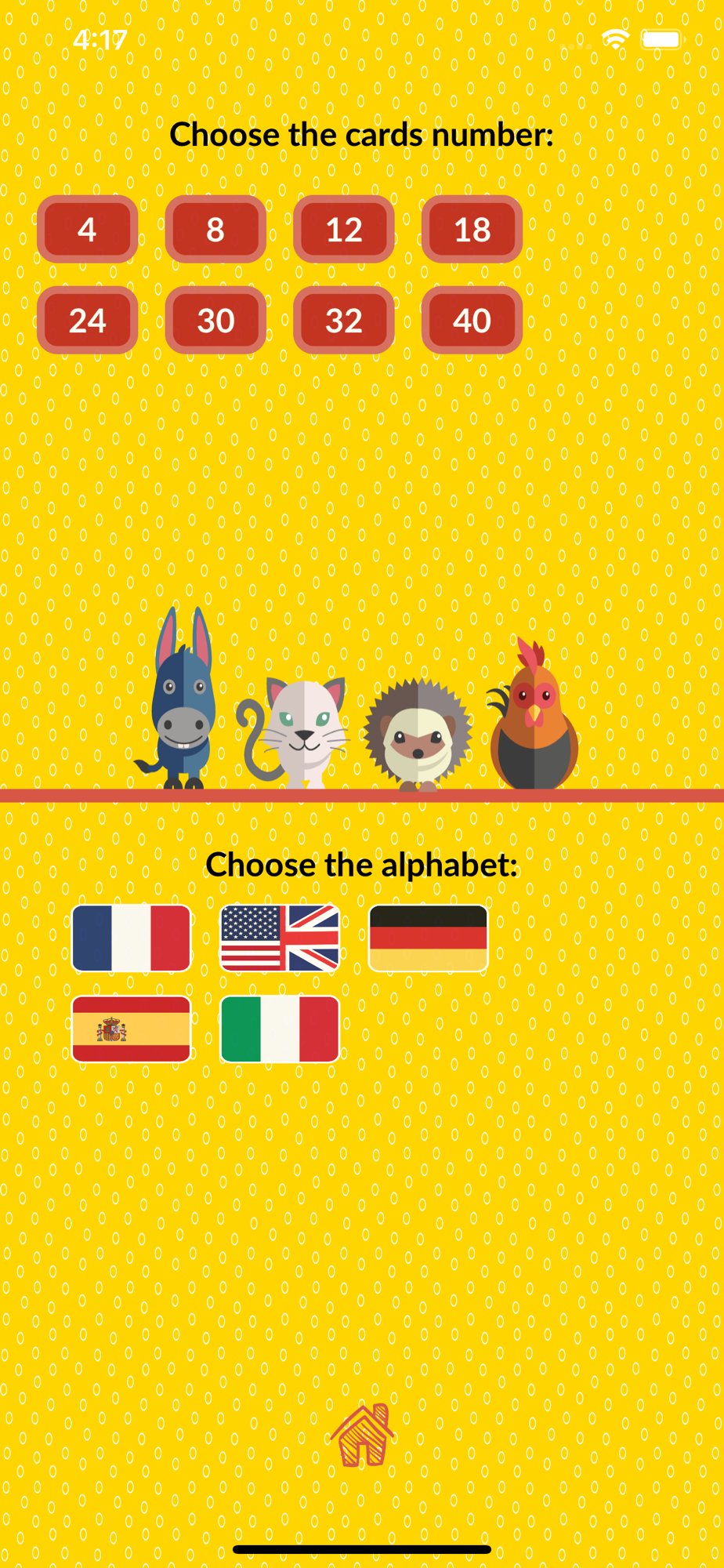 - Single game: you choose the number of cards and the language of the alphabet to play with;
