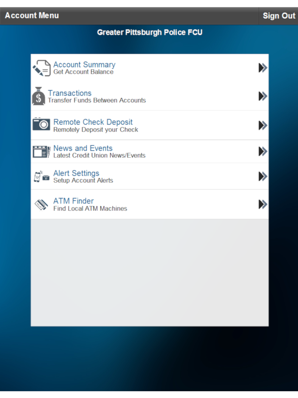 Greater Pittsburgh Police Federal Credit Union Mobile App requires an active account with the credit union. The account holder will also need to be enrolled with electronic services, such as Home Banking or Bill Payment.