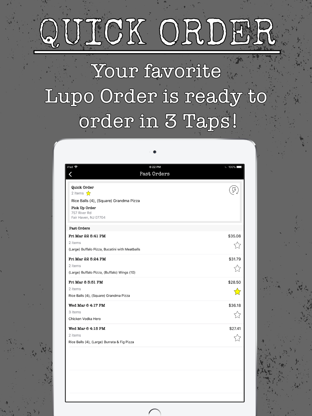 Quick Order - *Account Required* After you choose your favorite order, you now have the ability to order your Favorite Lupo Order in less than 3 taps!