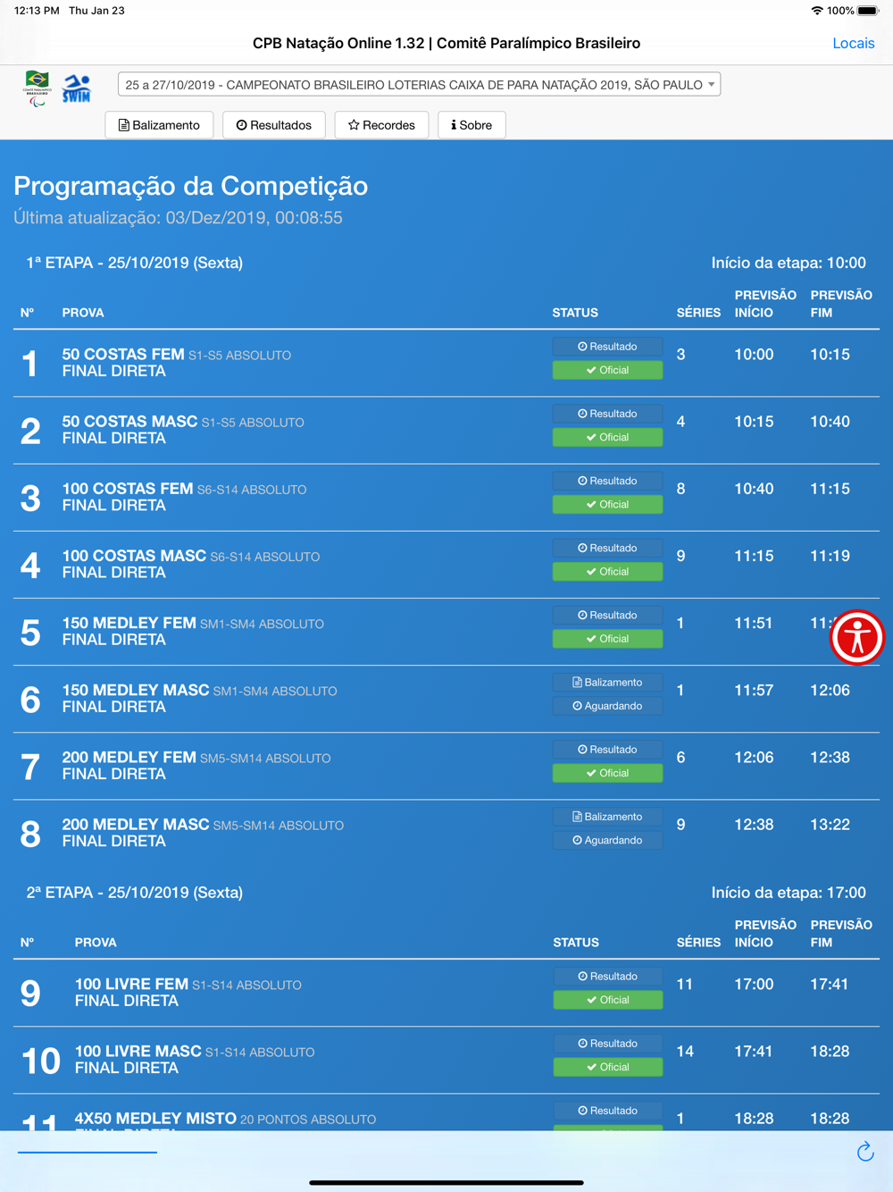 Confira todos os resultados e balizamentos das competições de natação promovidas pelo Comitê Paralímpico Brasileiro - CPB por todo o Brasil. O aplicativo fornece informações em tempo-real (quando anunciado) e permite checar informações de eventos passados.