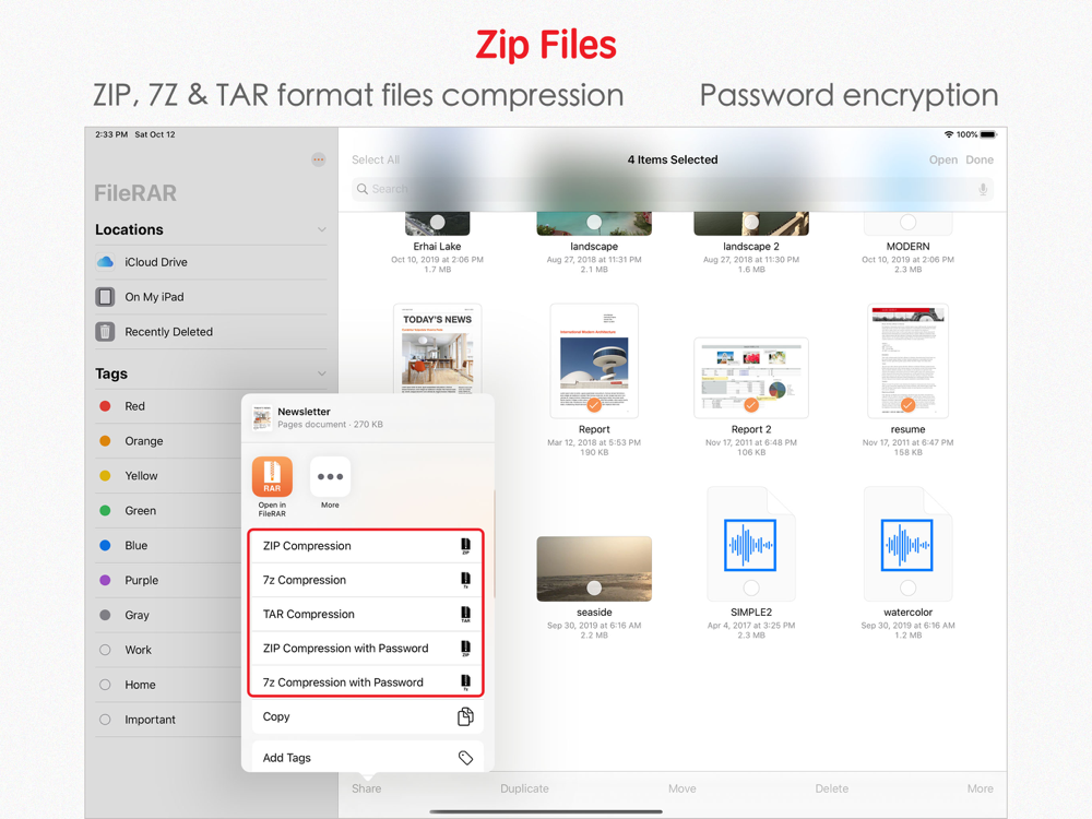 Fast Unzip is a ZIP and RAR file management app on iPhone/iPad! Most secure and fast Zip utility for business and professional users. It can extract ZIP, RAR, 7Z, TAR, GZIP and all other other compressed files. Supports compress files into ZIP file with encryption.