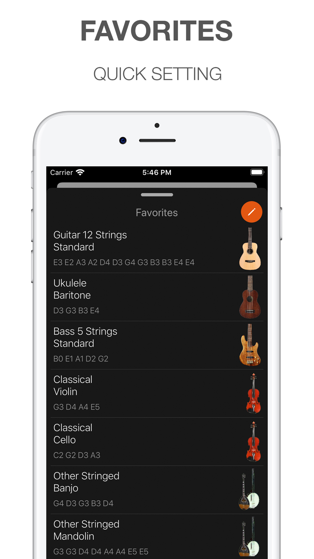 • Standard tuning for Guitar, Ukulele, Bass, Bass 5-string, Guitar 12-string, Ahenk, Chello