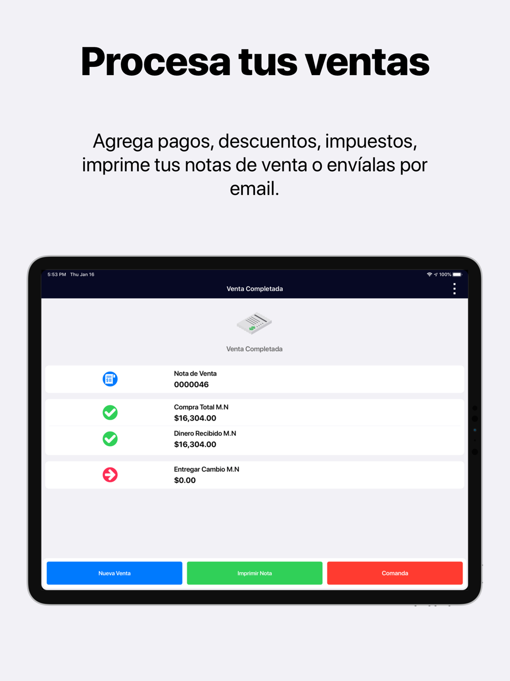 • Disponible el modo restaurante: permite agregar mesas y manejar cuentas / comandas y mucho más.