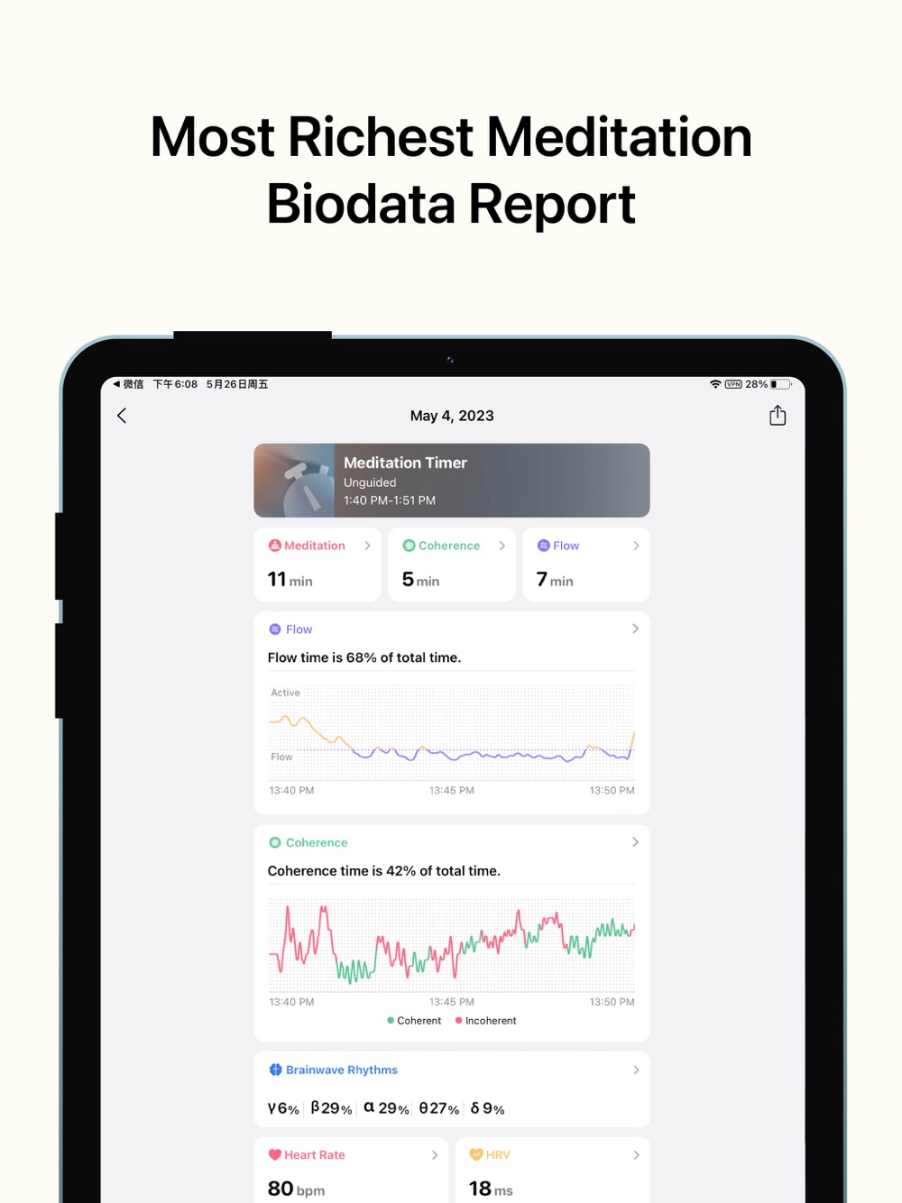 The real-time data matters when you are doing meditation, while rich biodata reports after practice are also crucial to measuring your practice every time and insights into your progress. The sensors passively sense your brain and heart activities, and the app translates them into visualized graphs of your body performance. You will be eager to see how well you perform after you practice.