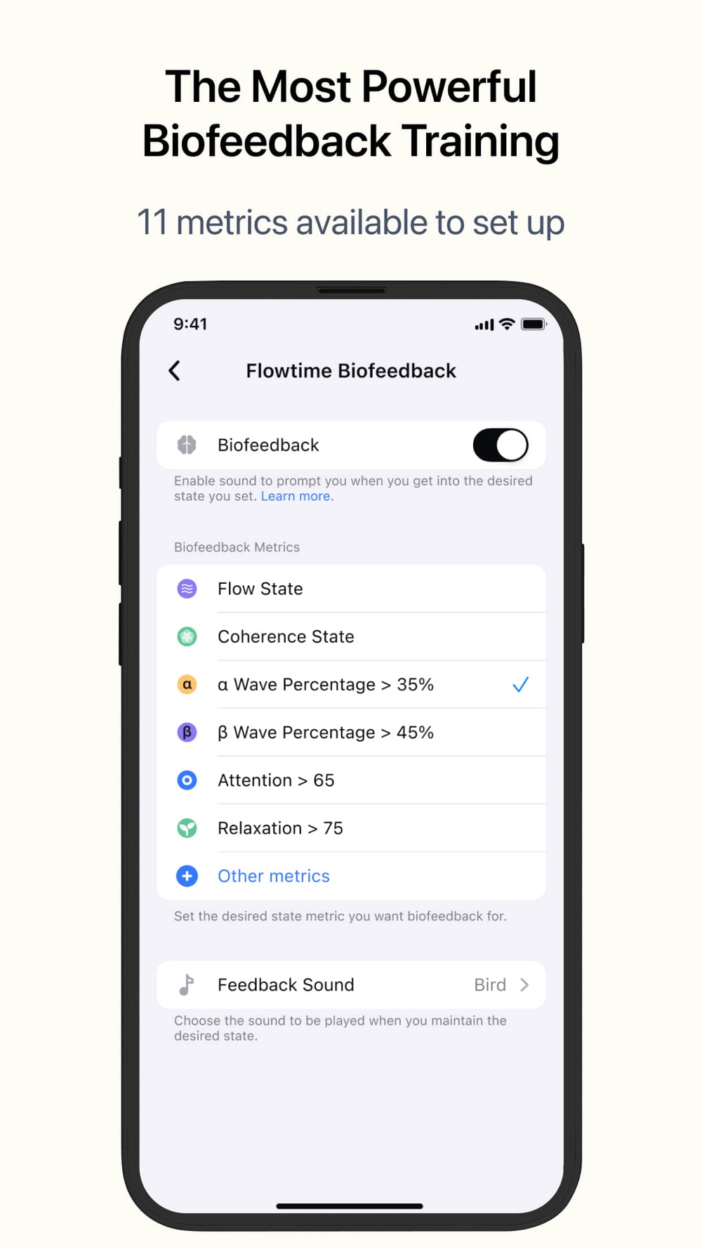 Know you're getting there as you hear the sound that verifies your desired state, whether it's flow, breath coherence, alpha or theta status, or focused concentration. No more guesswork or relying solely on feelings. There are 11 metrics available to set up.