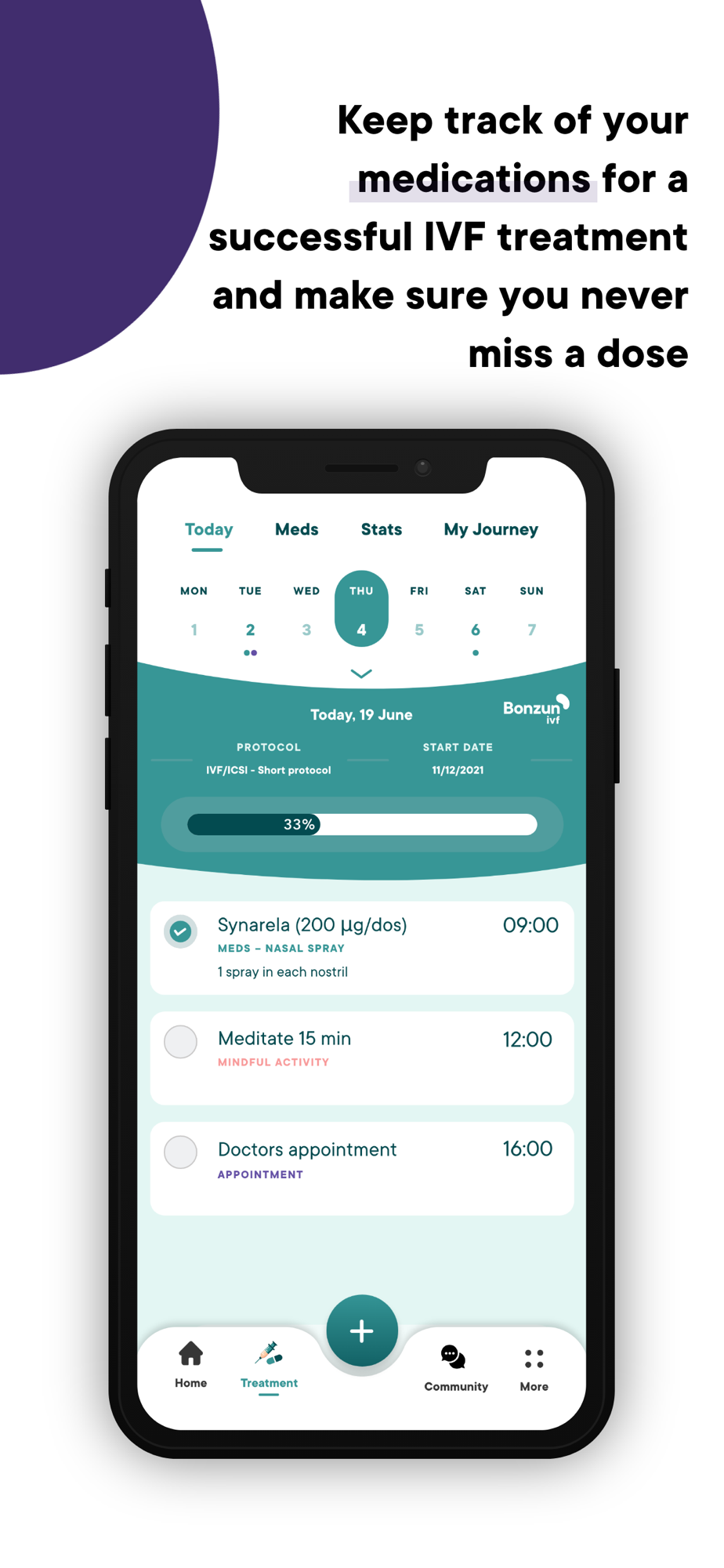 Bonzun IVF is specifically developed to increase the chance of having a baby with functions that will improve the IVF process, such as a medication feature to make sure you never miss an important dose as well as functions that will reduced stress. Bonzun IVF is CE-marked in accordance with European standards for medical devices and all content is medically reviewed by IVF physicians, researchers, psychologists and fertility experts. The app will guide you through your unique IVF treatment every step of the way and help you to gain more knowledge on how to perform your IVF treatment.