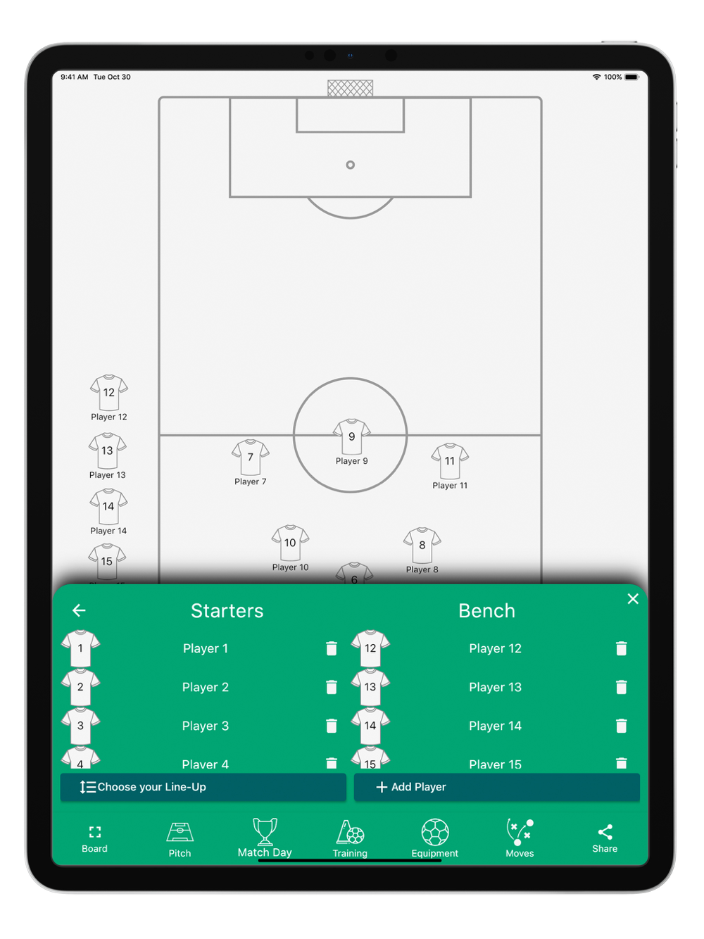 Select your game day formation from several formations that we offer. Make the decision to pick either a classical 4-4-2 or unexpected 3-5-2 with a "false 9" to compete on the pitch. Use the tactic board to compare your team to your opponent as well as visualizing how your team might adapt during the game. React in real time to tactical changes, individualize each position and show directly to your players for better understanding.