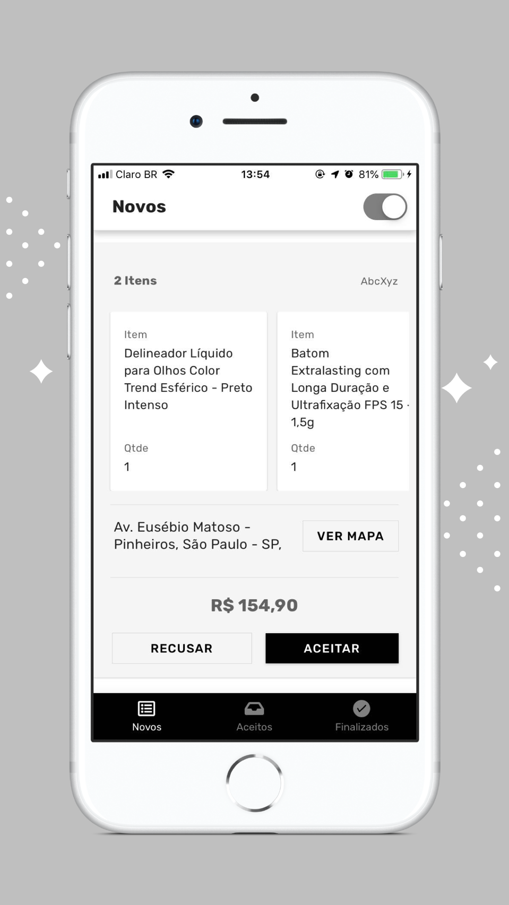 Um novo aplicativo simples e fácil de usar para você acompanhar os pedidos dos seus clientes. Visualize novos pedidos: veja o nome do produto, a quantidade, o valor e o local da entrega. Com a ajuda do mapa do Google você poderá se localizar e ver a distância até o local da entrega. Você poderá aceitar ou recusar o pedido, caso não seja conveniente para você. Os pedidos aceitos ficam na aba “Aceitos” e lá você poderá ver os dados do cliente, acompanhar e programar sua entrega. Após a entrega dos produtos, você poderá informar eventuais observações que podem ajudar a melhorar a experiência do serviço.