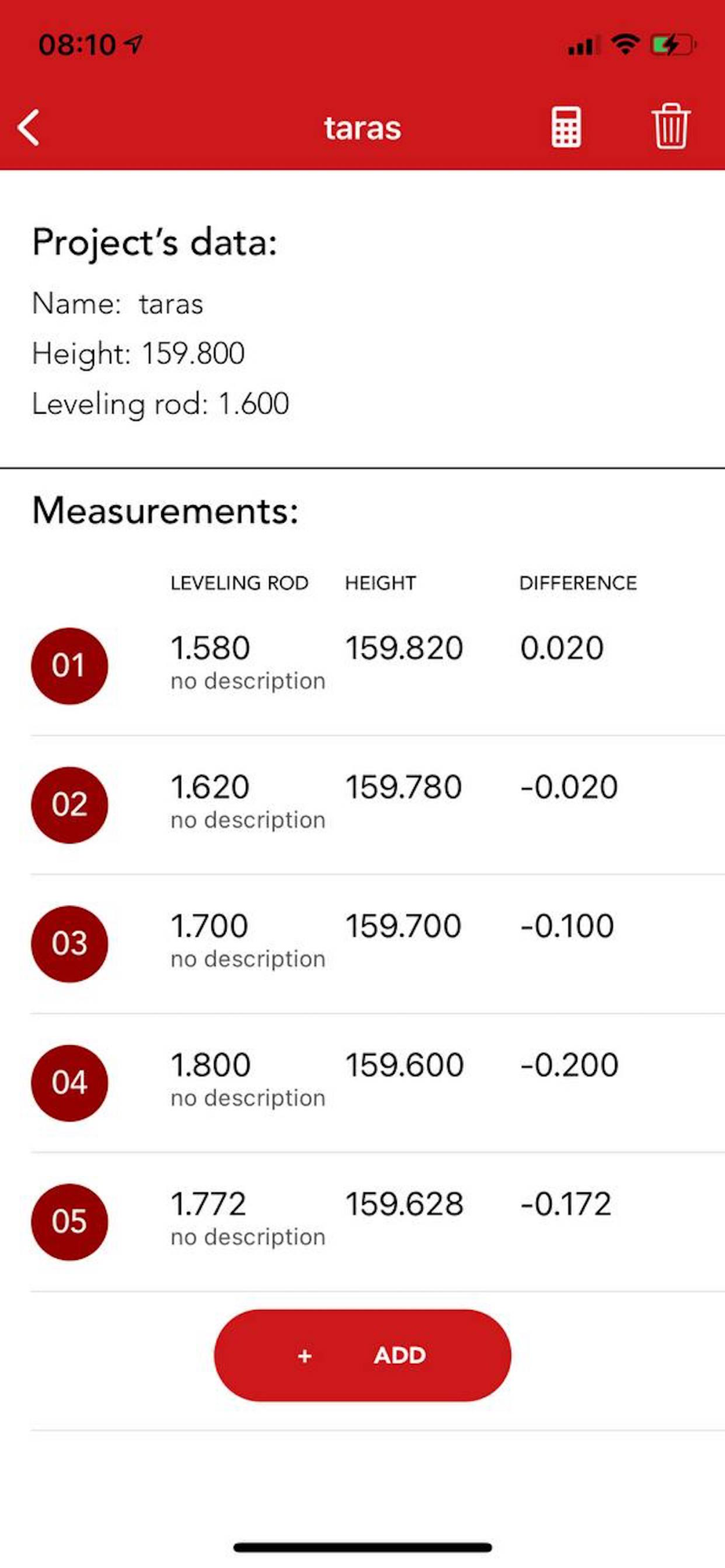 One place where you can calculate differences in ground level. Create project where you can save project data. Every measurement point will be showed in one cell and application will calculate them to values from project’s measurement scale and show them in other cell.Make only one time calibrate with your surveying level and enjoy relax automatic calculations without switching between applications.