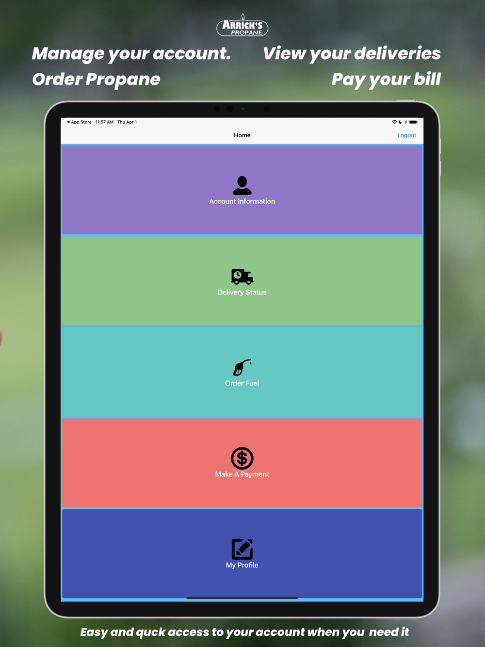 This is the Arrick's Propane Grayson App. The app allows users to view information about their account, order fuel, and make payments on their account using their device. Customers create a login for this app by using an account number that they obtain from registering on our website. There is no cost or fees to register and use this app.