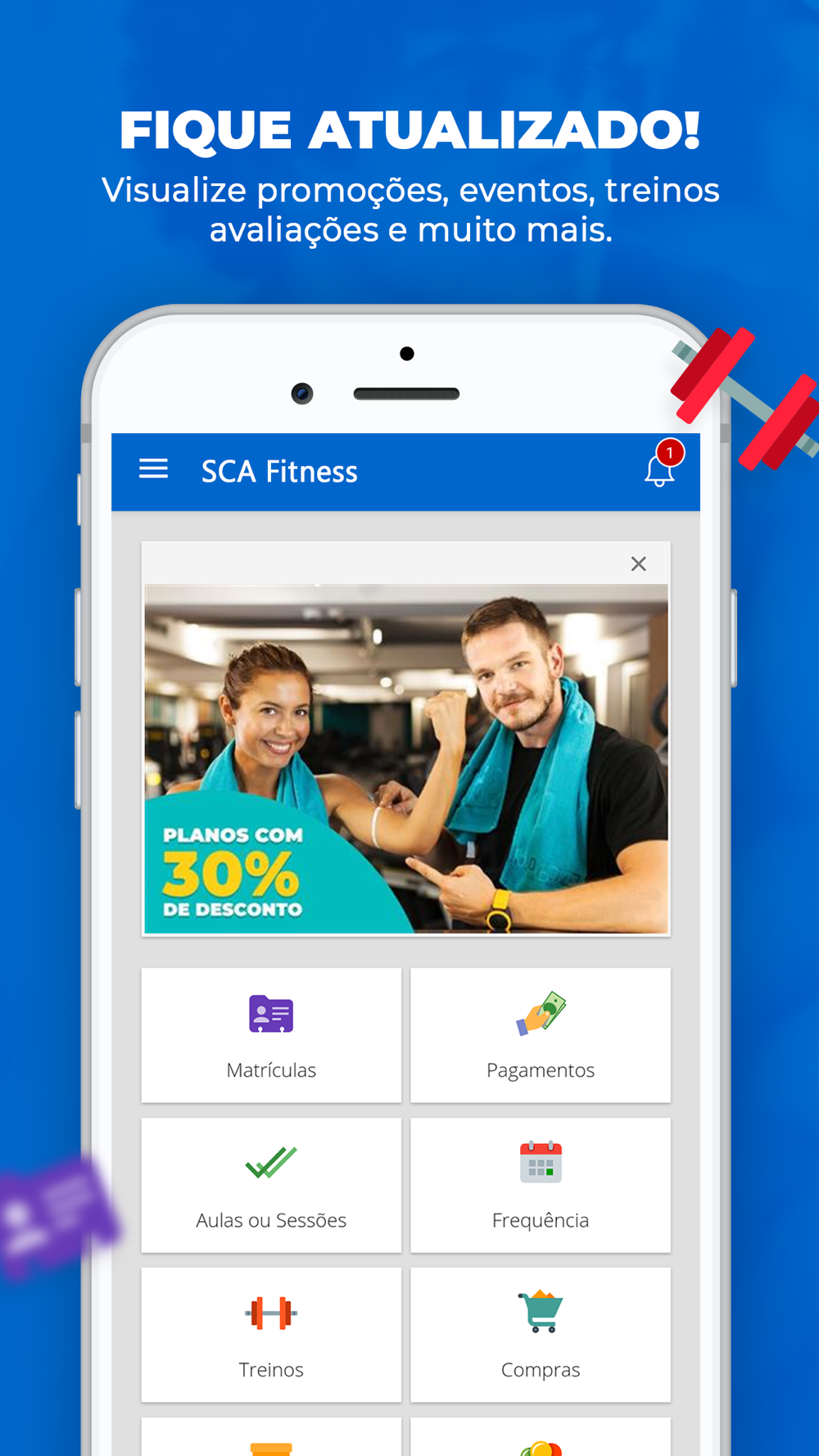 O SCA Aluno é um aplicativo disponibilizado para todos os alunos das academias que utilizam o Sistema SCA Online, com as seguintes funcionalidades: