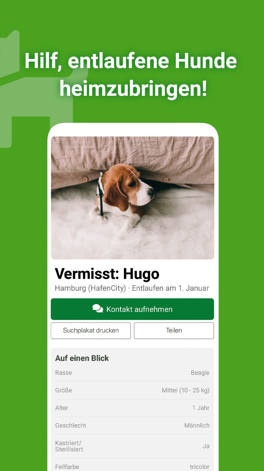 • Hilf mit, vermisste Hunde wiederzufinden. Ist in der Nachbarschaft ein Hund entlaufen, wirst du benachrichtigt und kannst gezielt die Augen offenhalten – oder du nimmst selbst die Hilfe der Community in Anspruch, wenn dein eigener Vierbeiner entlaufen ist.