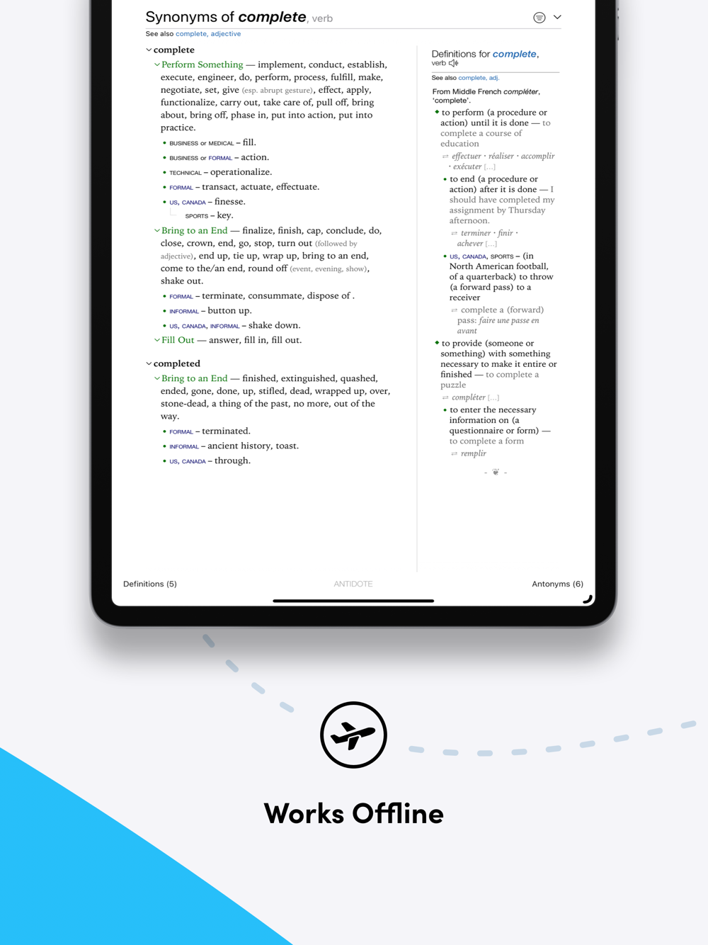 Antidote Mobile provides rich definitions, abundant synonyms, massive word combinations and much more, in an elegant and efficient interface. Use powerful search engines to find rhymes, anagrams, and other links between words, even with wildcards. Listen to words in all their forms in 4 accents. Display 2.7 million translations of words and expressions, or hide them to work in a single language.