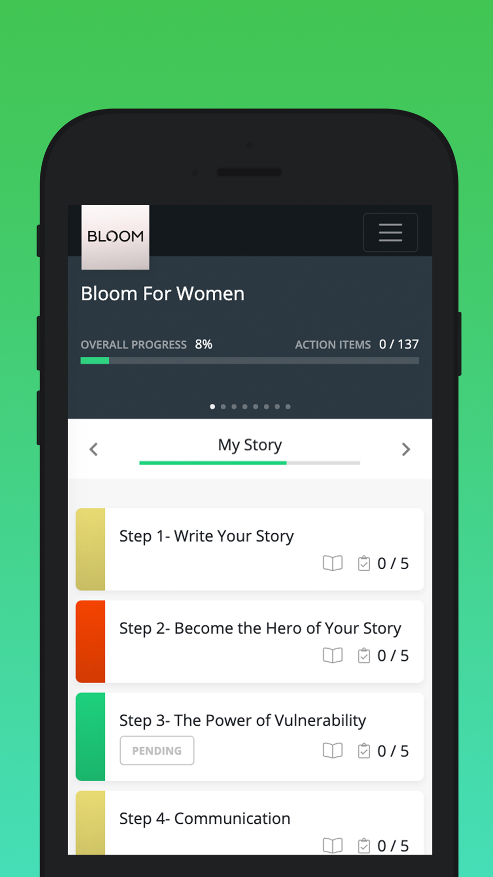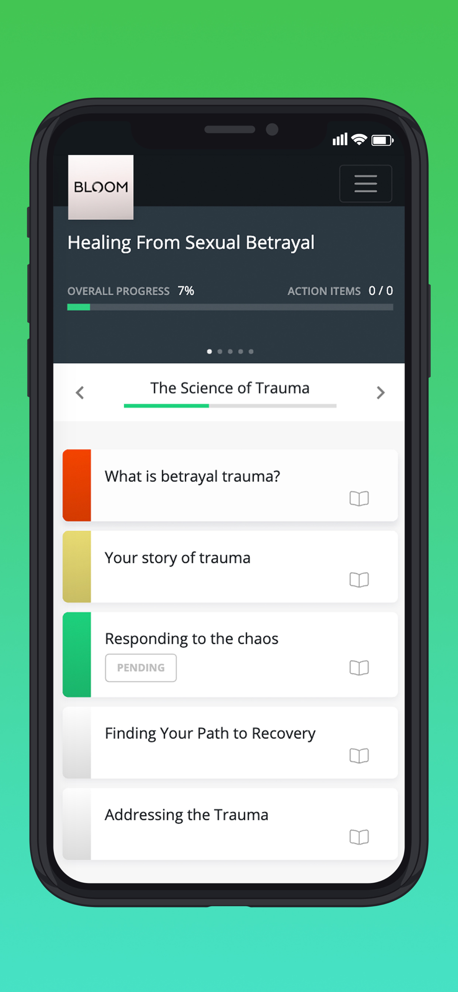 Healing from the hurt and heartache of betrayal trauma take work. Not just any work, but work that is focused on moving you forward. The Bloom coaching app is your companion to help you understand your path. We provide you with simple and easy-to-follow assignments to help you gain the education and understanding needed to heal. Our curriculum addresses: