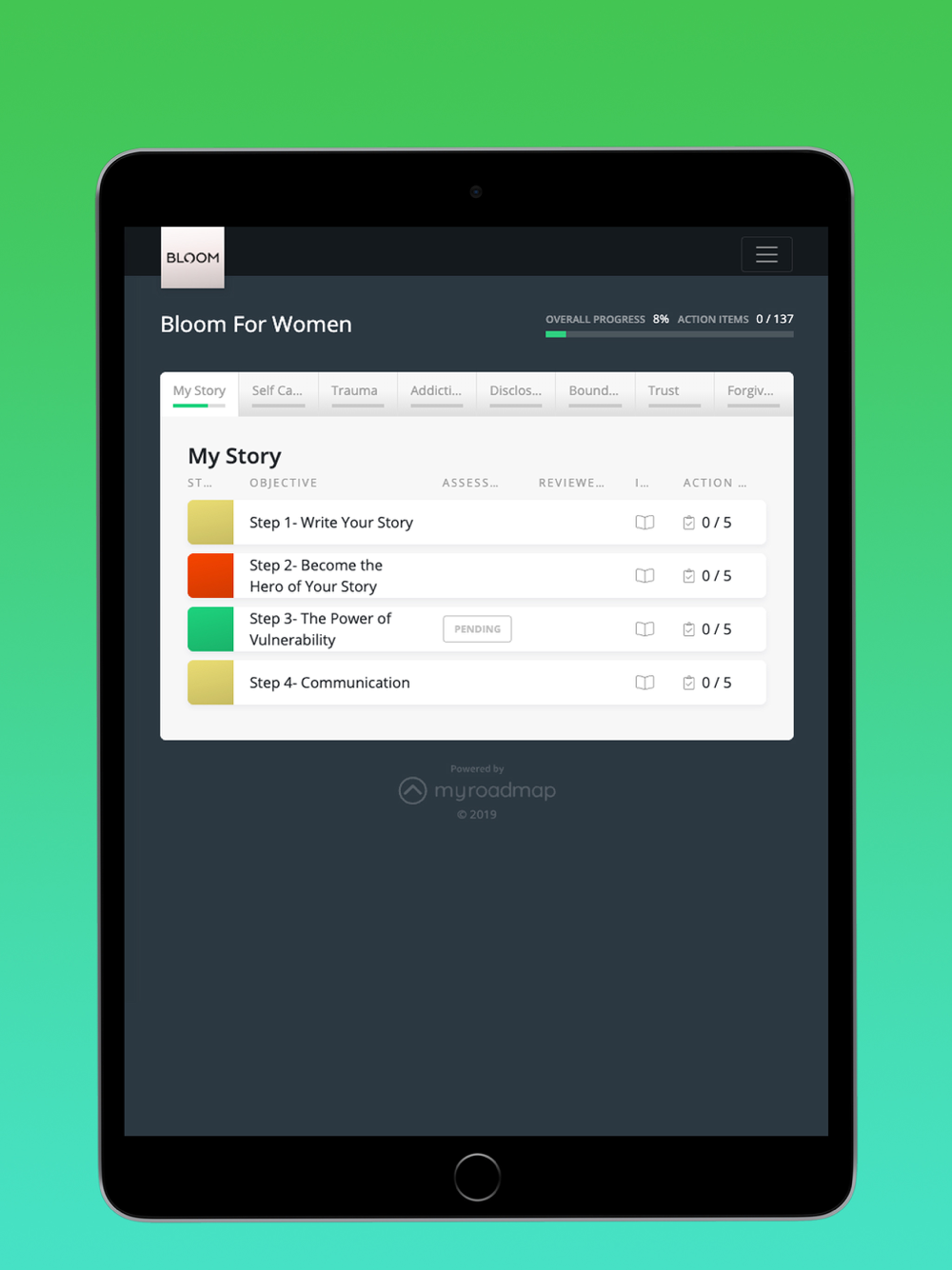 - Assignments that will define the skills and steps you need to develop in order to heal
