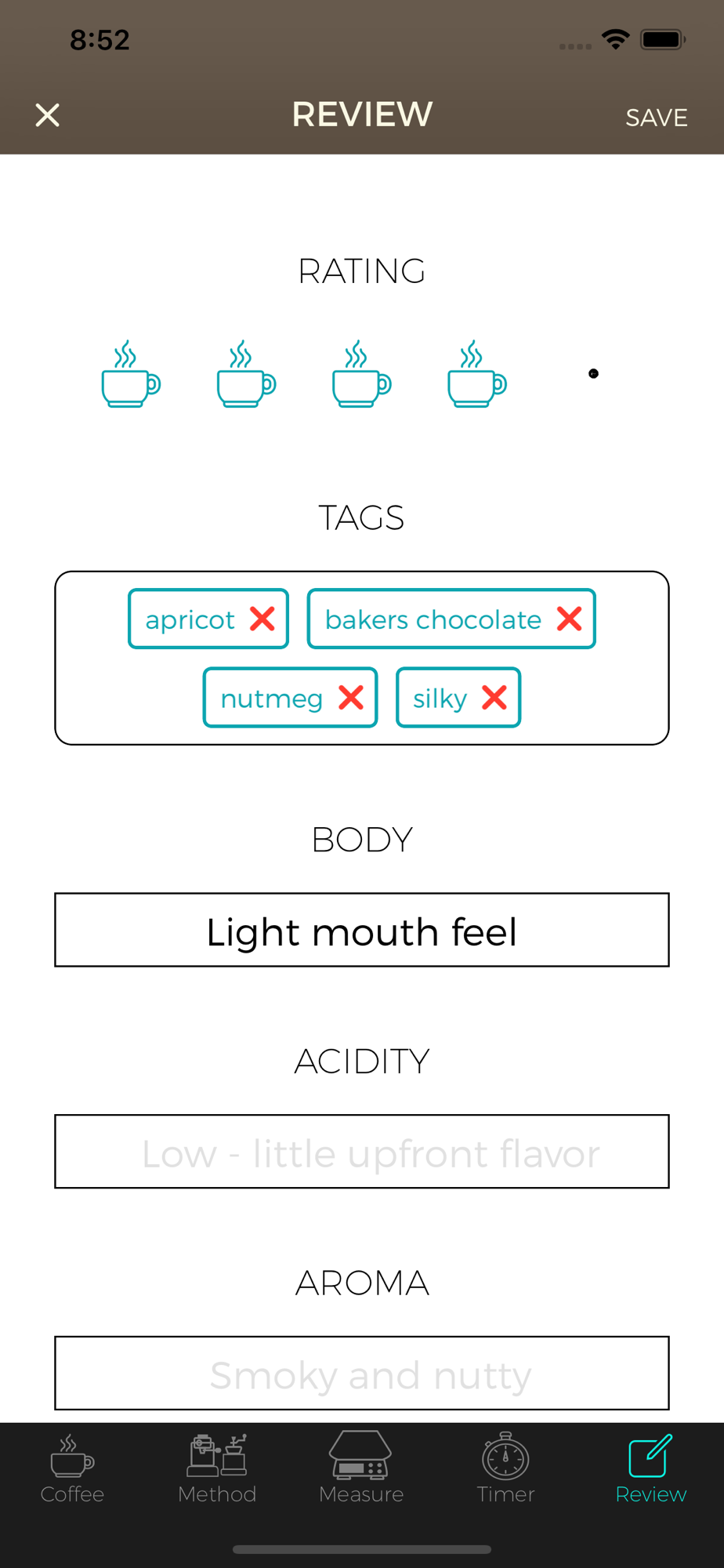 Record everything about your coffee experience. Use this app to remember certain brewing methods, for intricate timers, cupping reviews and more. You can take photos of your brew method set ups and save them also. If there is something special about your technique, you can record it with this app.