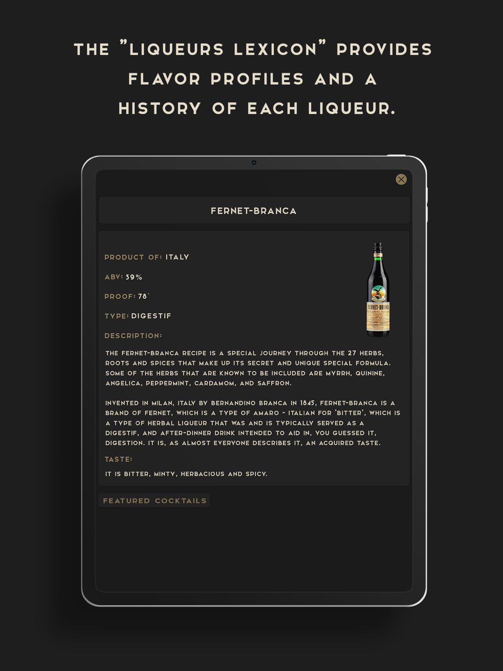We offer step by step instructions and exact measurements in order to create your favorite cocktails. The app helps you pick the right glassware and garnish as well as providing the approximate prep time. Also, there is a fun fact on the history of the cocktail.
