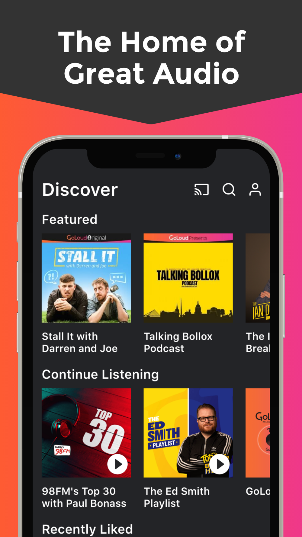The GoLoud Player is the ultimate audio experience where you can listen to the best selection of Irish radio, the most popular podcasts from around the world and exclusive music playlists for every mood and occasion curated by our music experts.